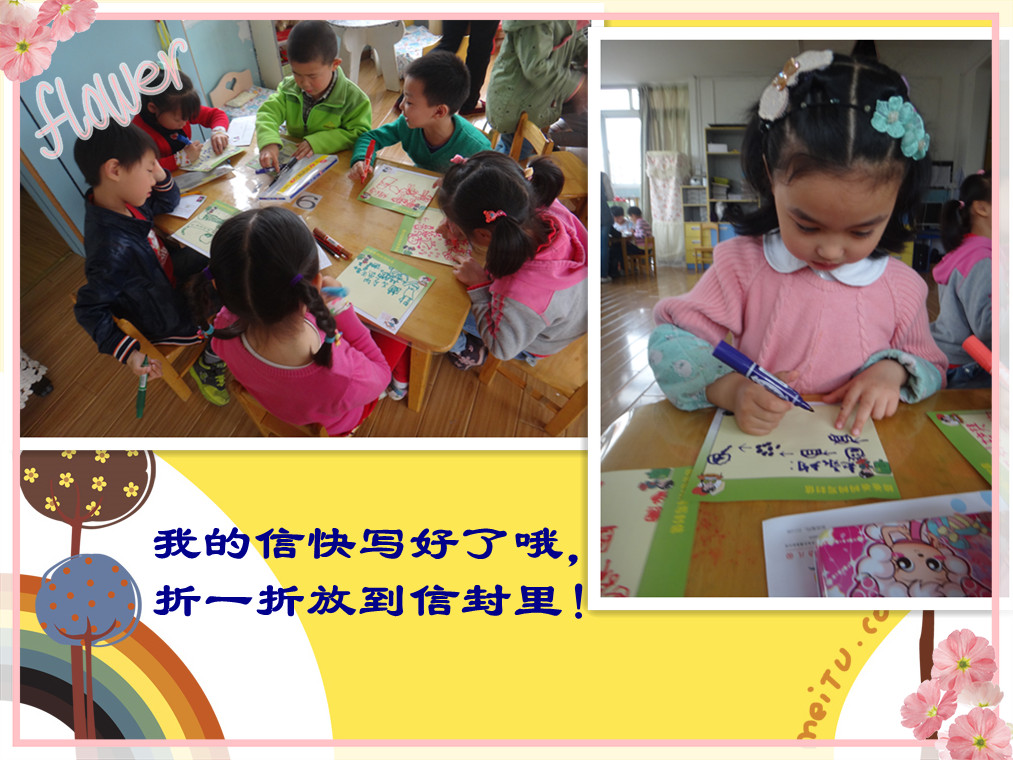 写好了信,折折好,放到信封里,这样邮递员叔叔就可以送给爸爸妈妈了!