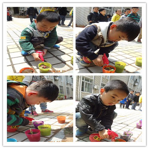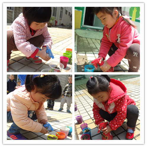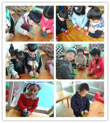 春天到了,老师带我们种了很多植物,这样到夏天和秋天的时候我们就可以吃到我们亲手种的东西啦!今天我们要种洋花萝卜,我们的任务就是在装好土的杯子里用手指抠一个大大的洞,这样萝卜就有一个大大的家了。