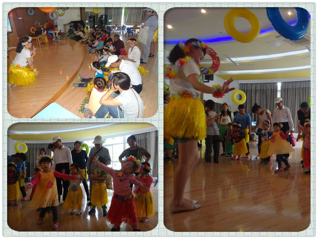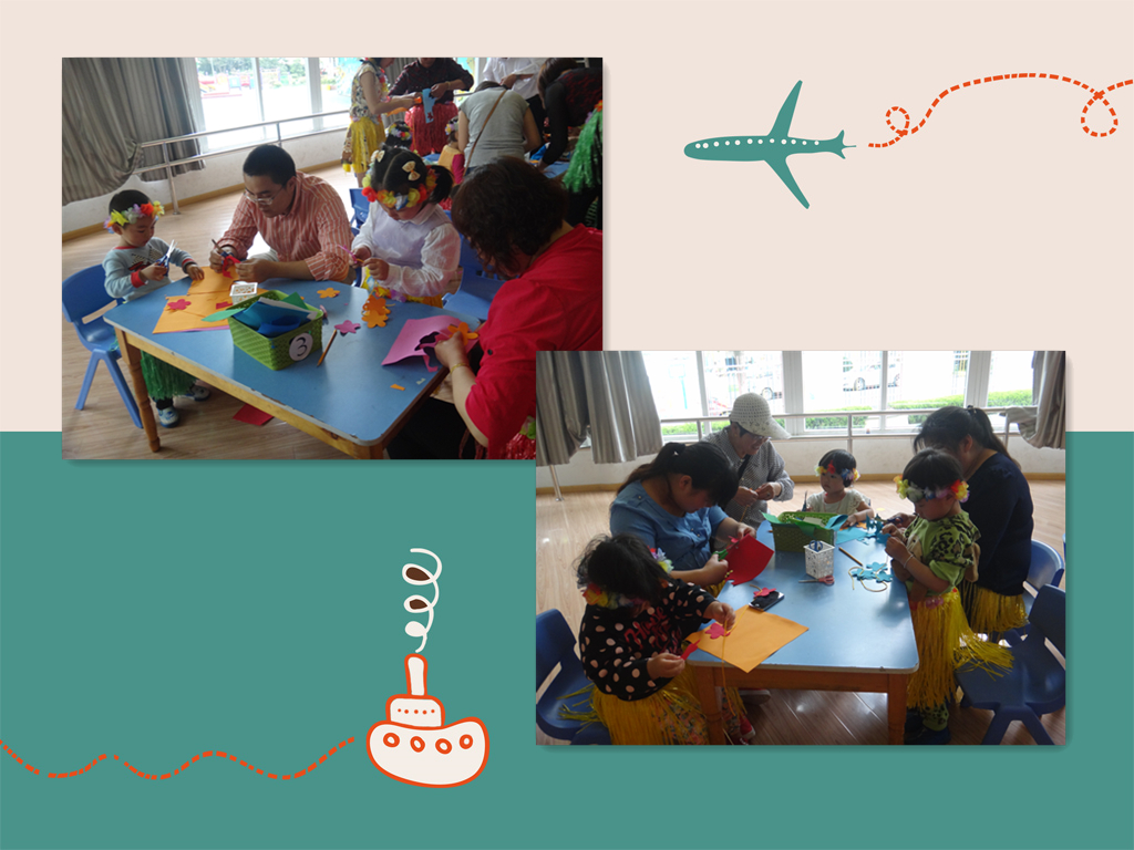 5月16日下午4:00,预约报名参加活动的家长带着孩子陆陆续续地来到幼儿园,当孩子看到布置得如同海滩的多功能厅,当孩子和家长都穿上美丽的草裙,他们禁不住开心的手舞足蹈。接下来的活动从欣赏夏威夷美丽的风景、诱人的美食、热情的草裙舞,一直到亲子制作花环、亲子学跳快乐的草裙舞,环节紧凑、亲子互动频繁。虽然是一群没到入园年龄的小小孩,可是每一个孩子都能积极参与到活动当中,表示出了极大的兴趣,现场氛围一片温馨快乐。
