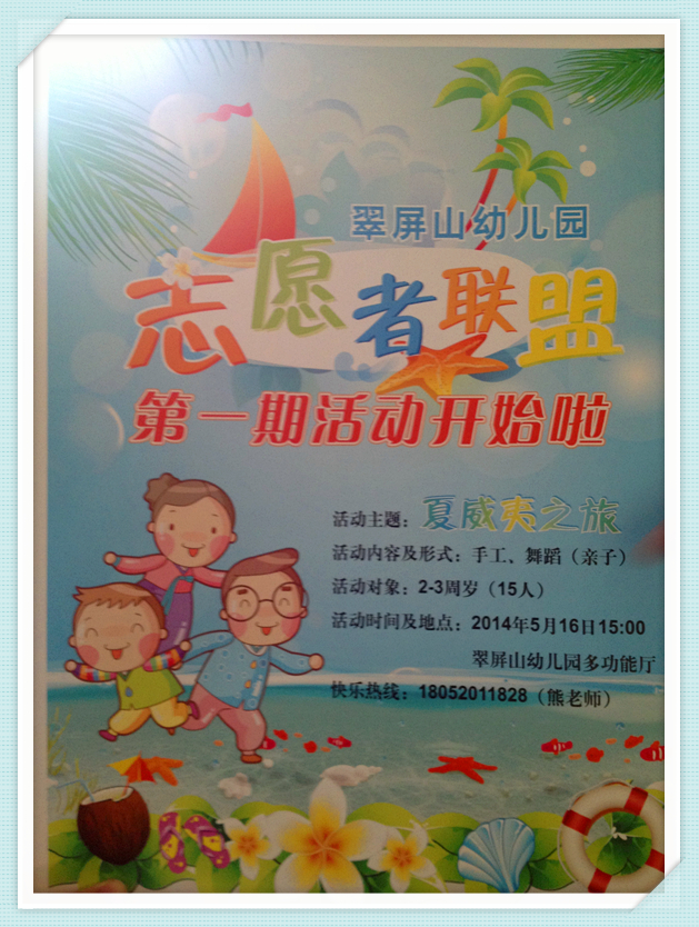 美丽的海滩、七彩的太阳伞、舒适的躺椅、高低悬挂的游泳圈、一群身着草裙头戴花环的老师……5月16日,走进翠屏山幼儿园多功能厅,就仿佛走进了风景旖旎的夏威夷。这是怎么回事?原来翠屏山幼儿园志愿者联盟活动开始啦!本次活动的主题就是“夏威夷之旅”,让家长和孩子在看看、说说、做做、跳跳中充分感受夏威夷热情四射的魅力。
