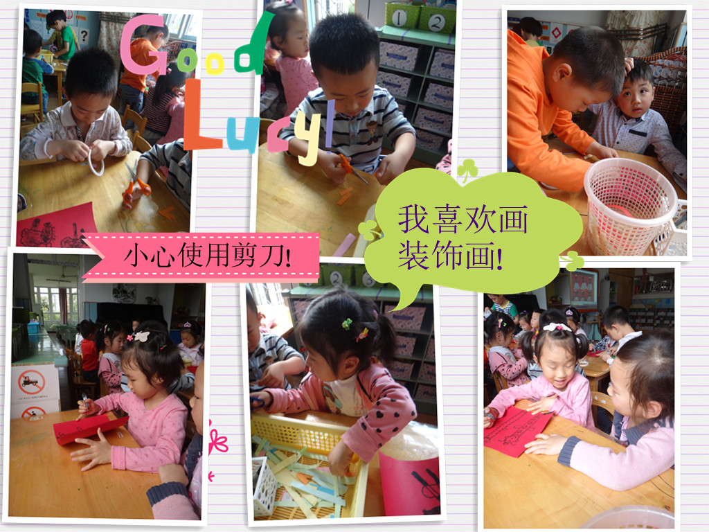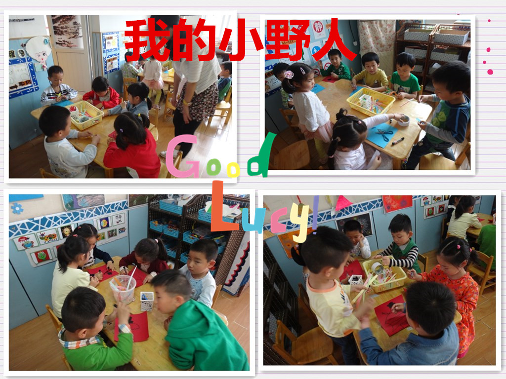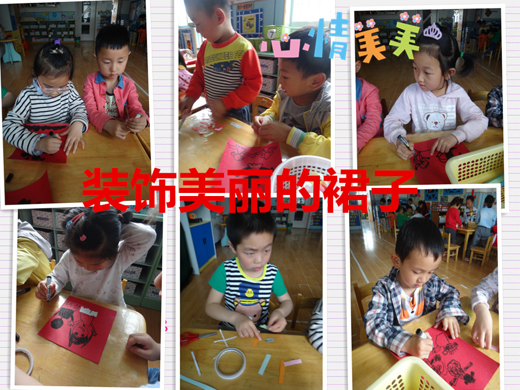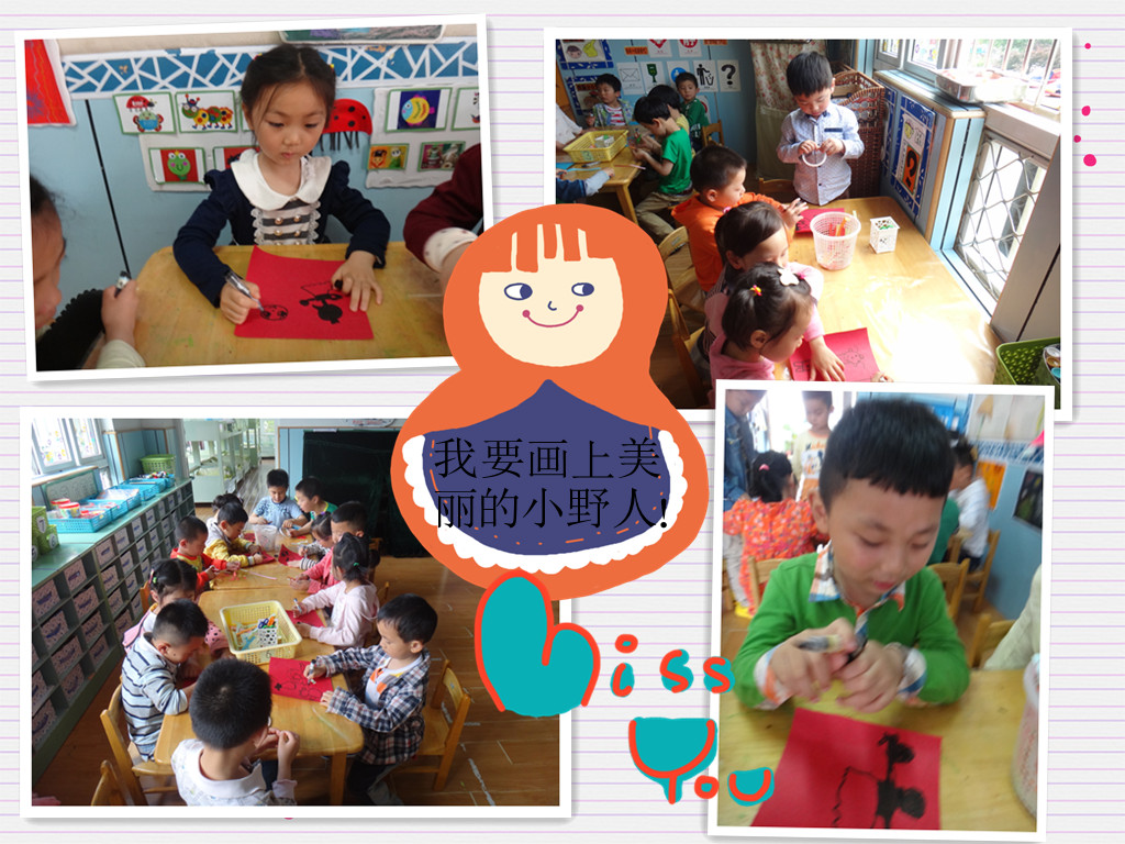 首先我们画了一个个小人并给它设计了美丽的裙子。紧接着我们给画好的裙子用彩色纸条进行装饰。最后我们用马克笔、油画棒进行点缀装饰小野人背景。
