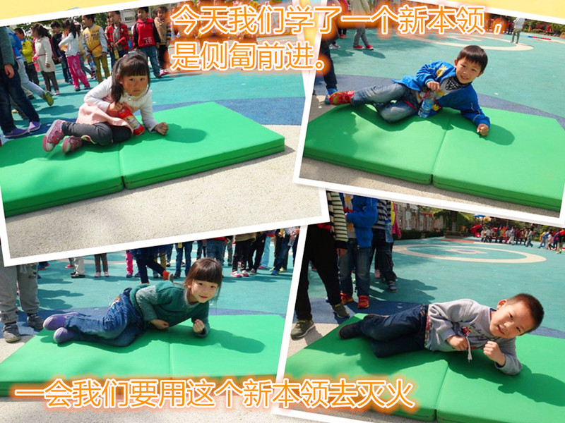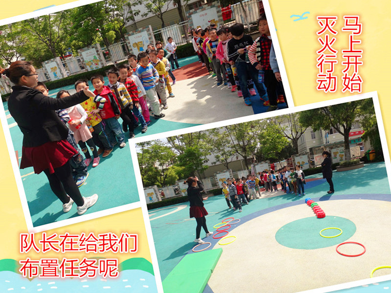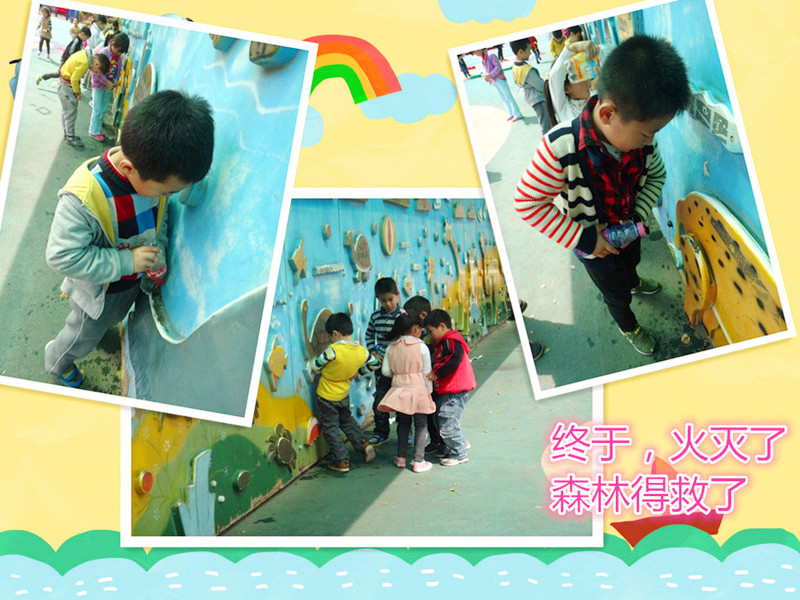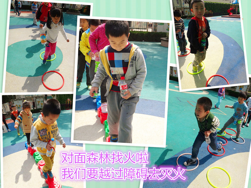 小小消防员 今天我们是消防员,森林着火了,需要我们去灭火。我们没有消防车怎么办?没关系,我们每人自备了一个水桶。森林可要撑住,我们马上就到。