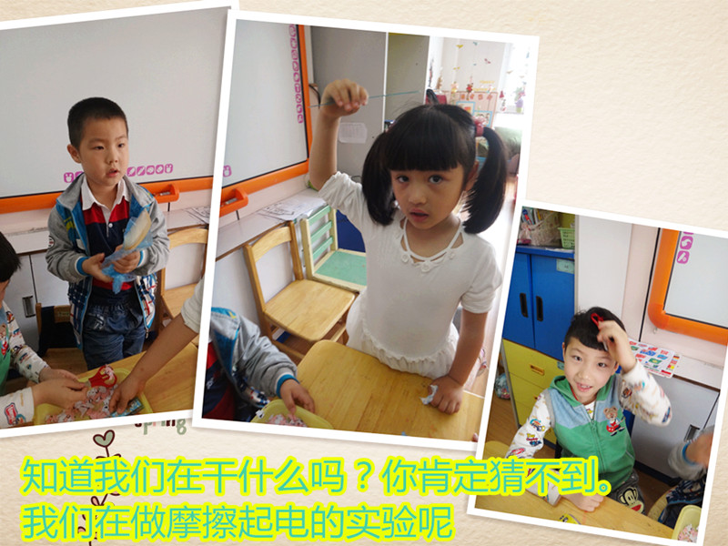 摩擦起电 今天傅老师变了个魔法,能用尺子直接吸住纸片不掉?怎么回事呢?原来是是用尺子摩擦头起电,才能吸住纸片。哈哈,我们也要做这个实验,快点开始吧。
