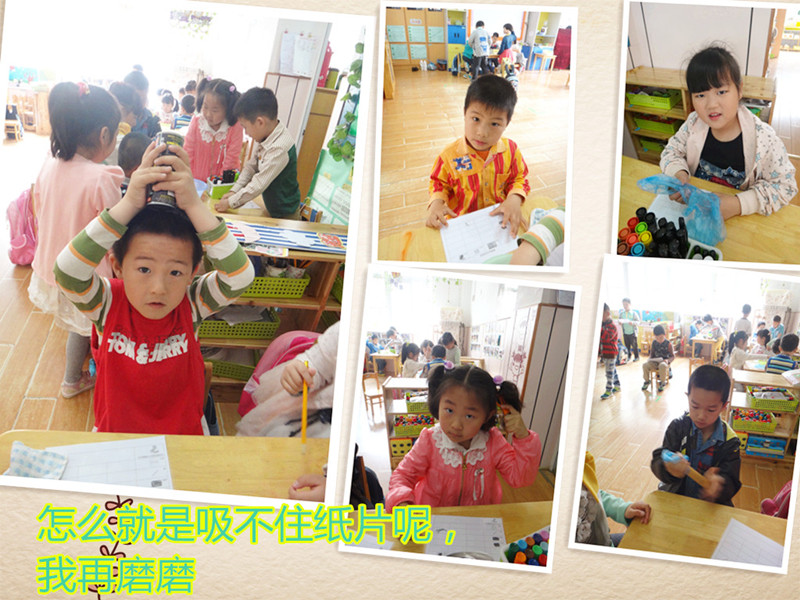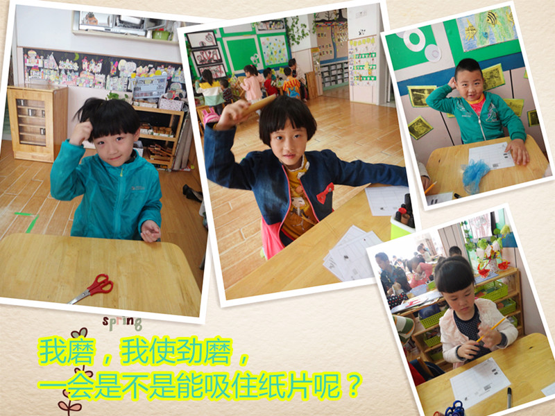 我用梳子吸住了纸片,我用积木吸住了纸片,我用铅笔吸住了纸片,我用剪刀吸住了纸片。真好玩! |