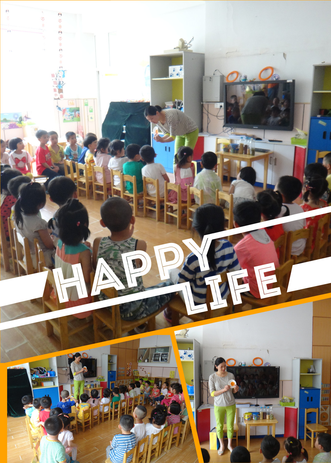 妈妈老师向孩子们展示美丽的种子镶嵌画。