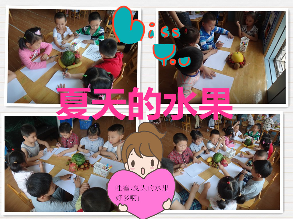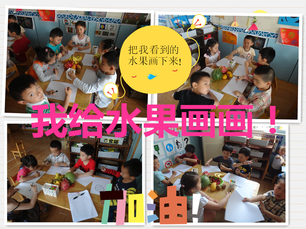 今天,我们将不同的水果摆在一起拼出了多样的造型,先从不同的角度观察水果的位置与形态,并画出了水果的造型。你瞧!