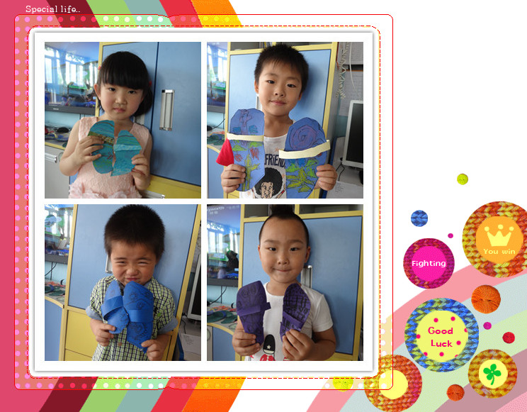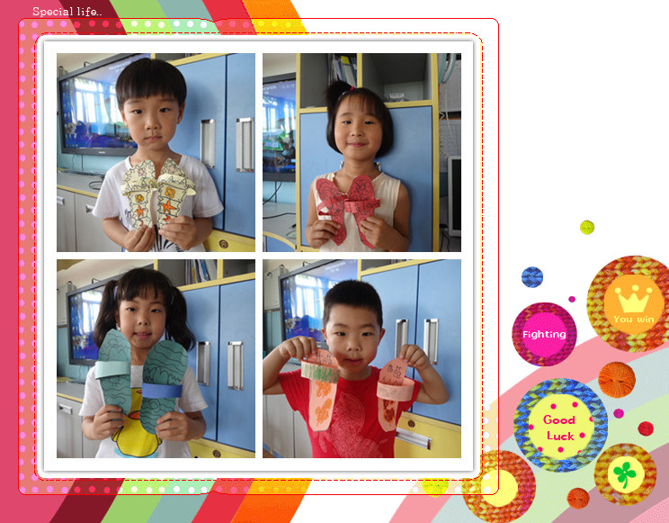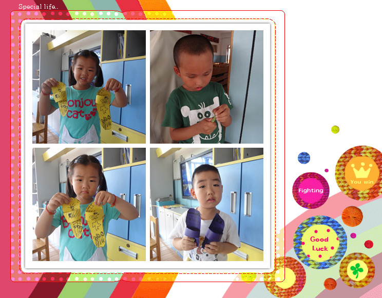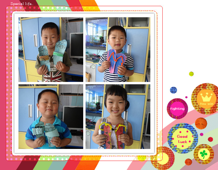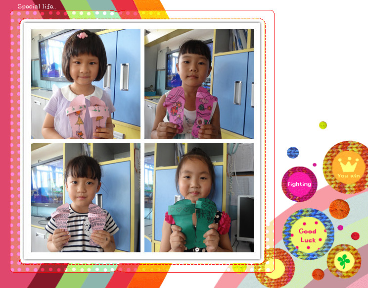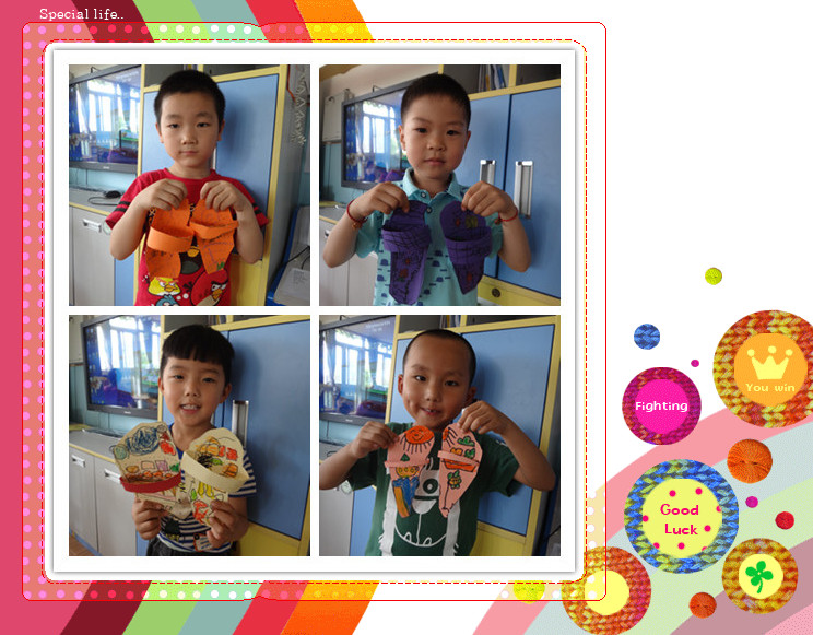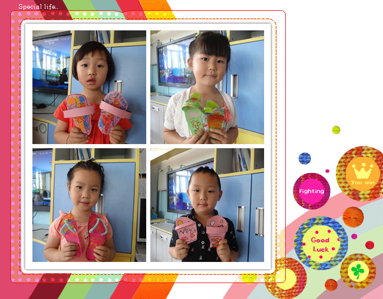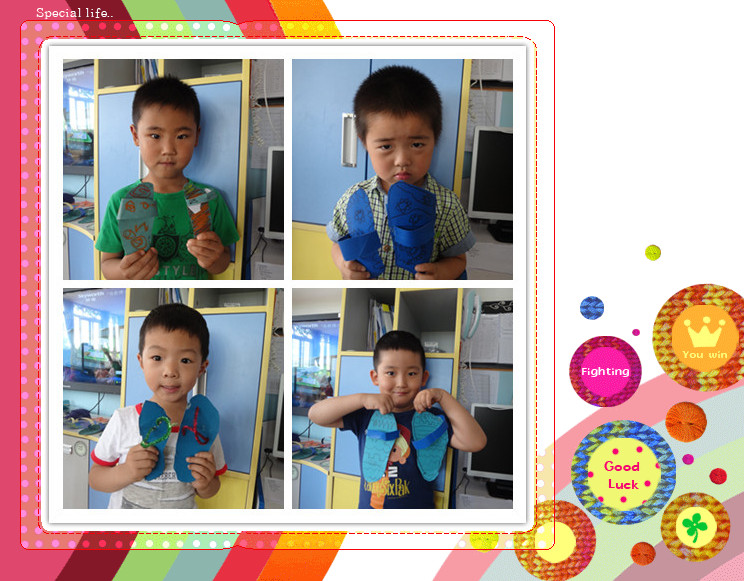 夏天到了,我们要为自己做一双美美的拖鞋,我选择了自己最喜欢的颜色,按照自己脚的大小为自己画了鞋样子,还装饰了好看的图案呢,爸爸妈妈快来欣赏我自己做的拖鞋吧。