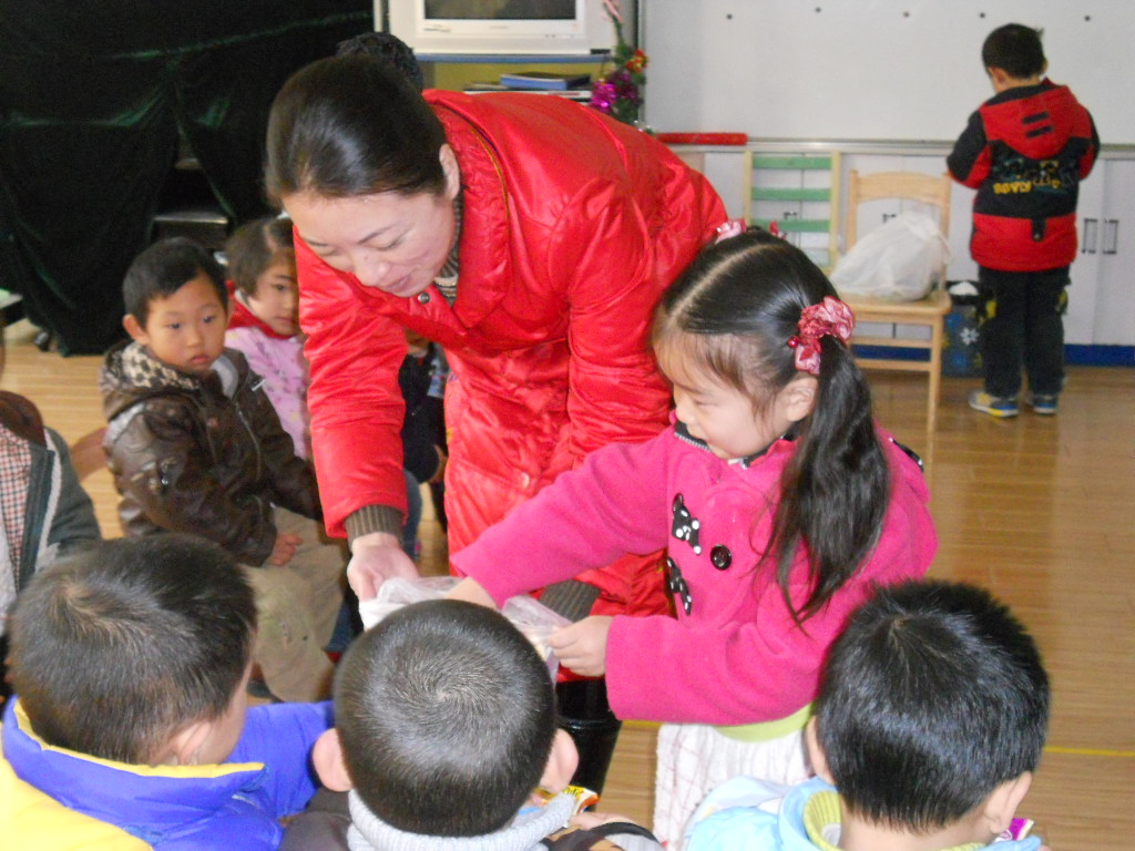 吆,妈妈还带了好吃的呀!快发给我们宝宝 下面看我们一起表演吧!我们表演的节目