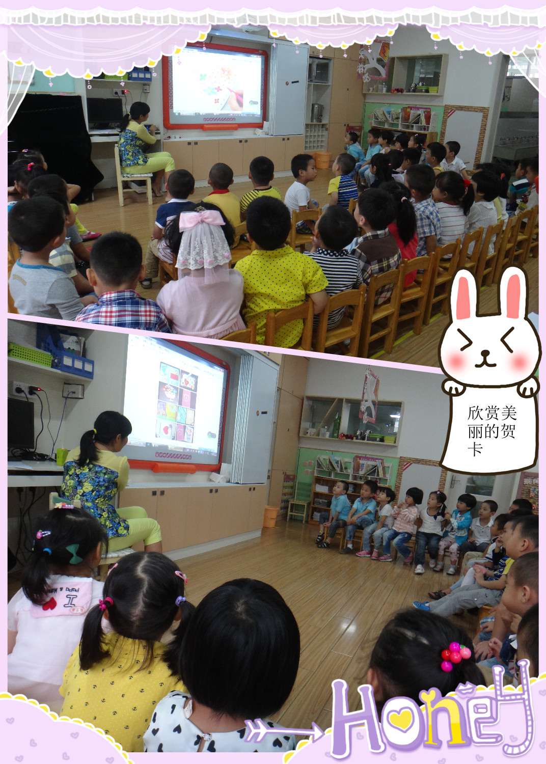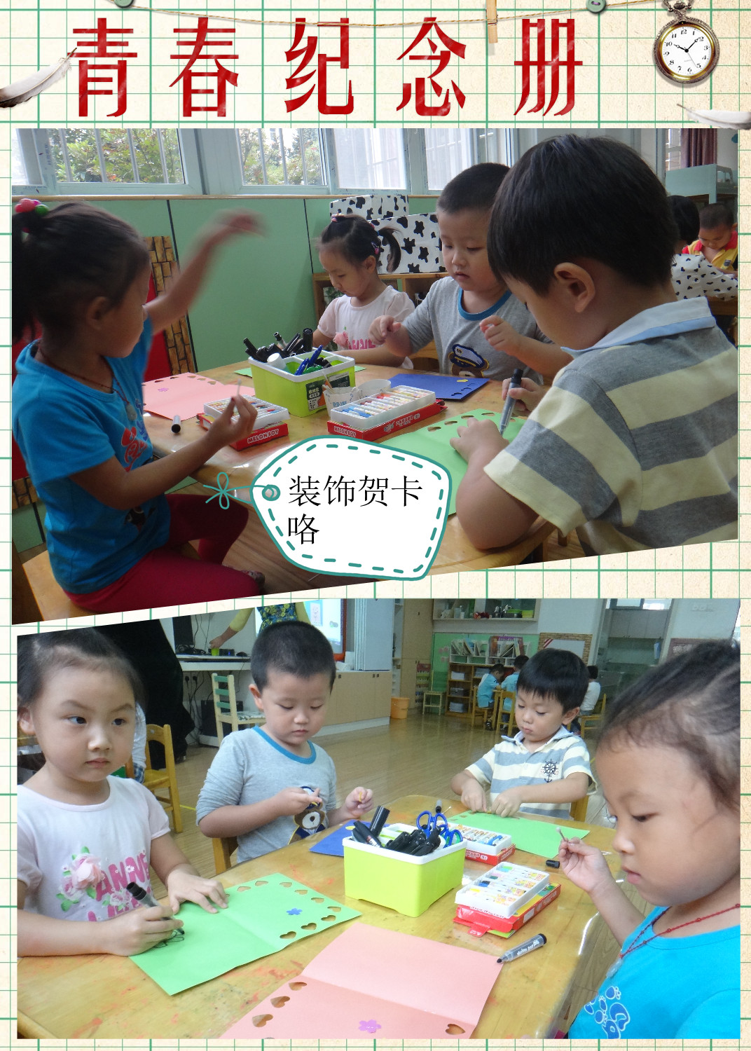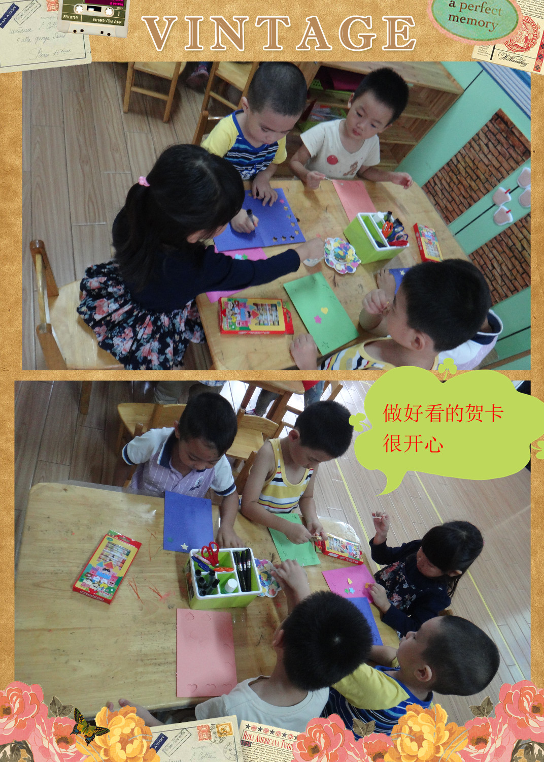 的材料为了让宝贝们做出漂亮的贺卡。活动前老师给小朋友们欣赏了许多漂亮的贺卡
