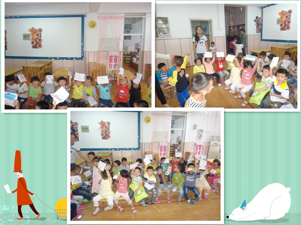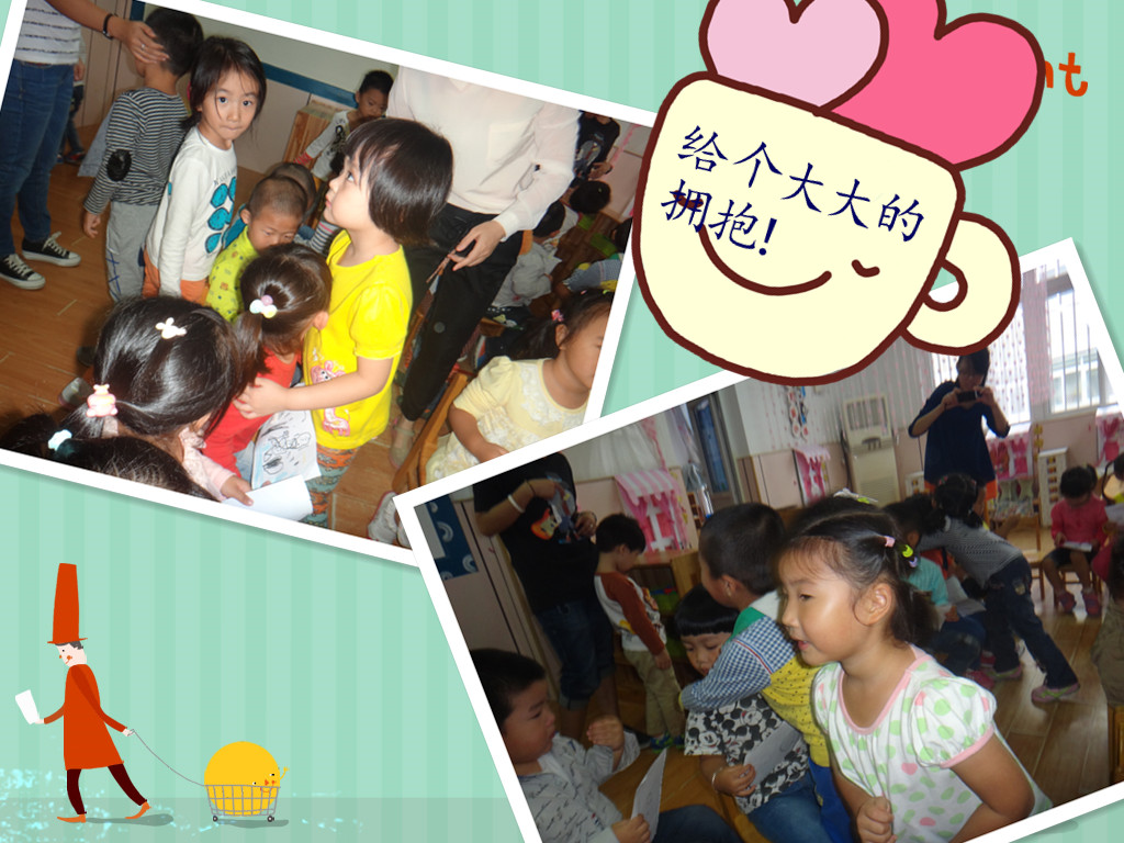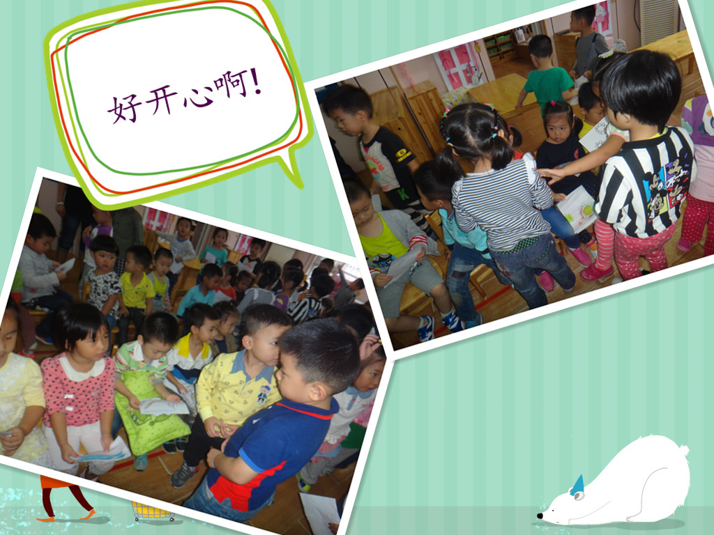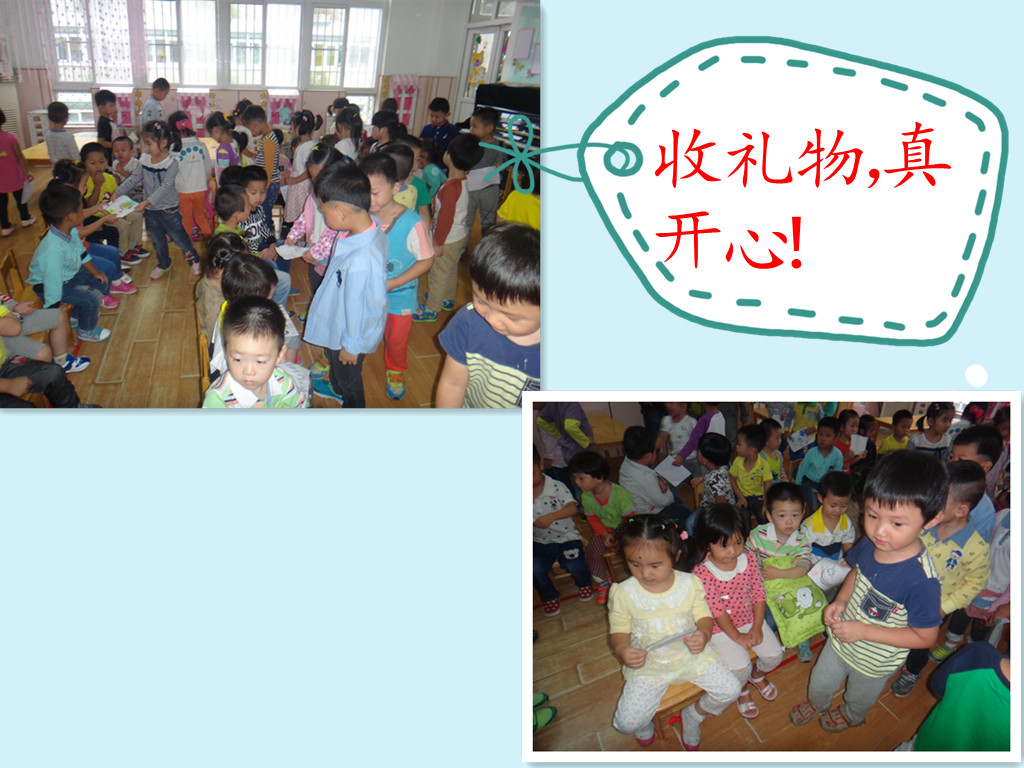 今天好开心啊,大班的哥哥姐姐来给我们送礼物了,我们每个小朋友都收到了哥哥姐姐送的礼物哦,等我们长大了,我们也要给弟弟妹妹送礼物!