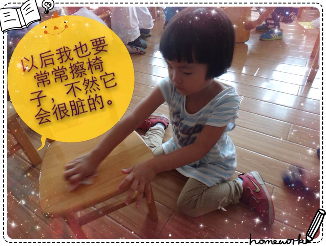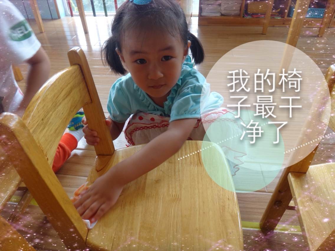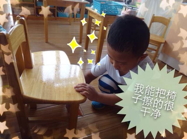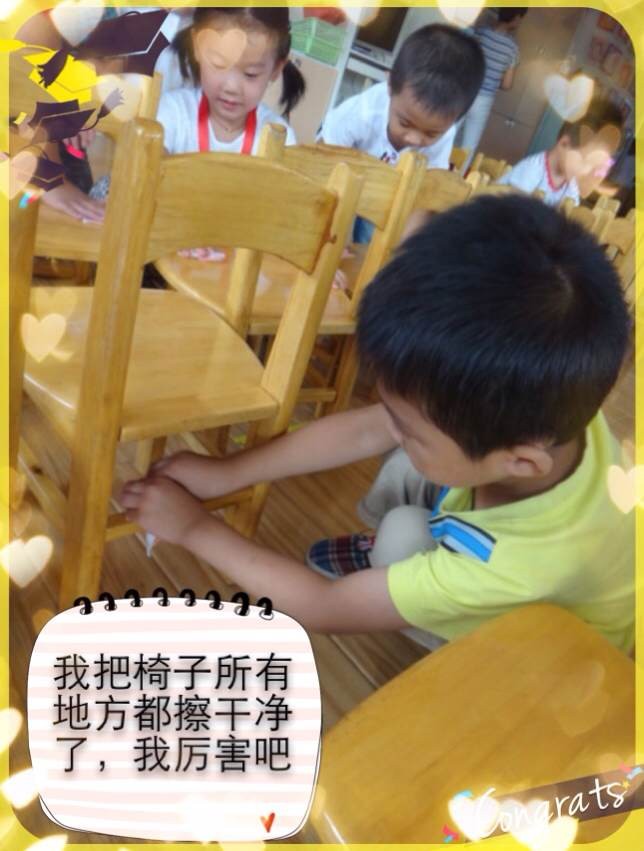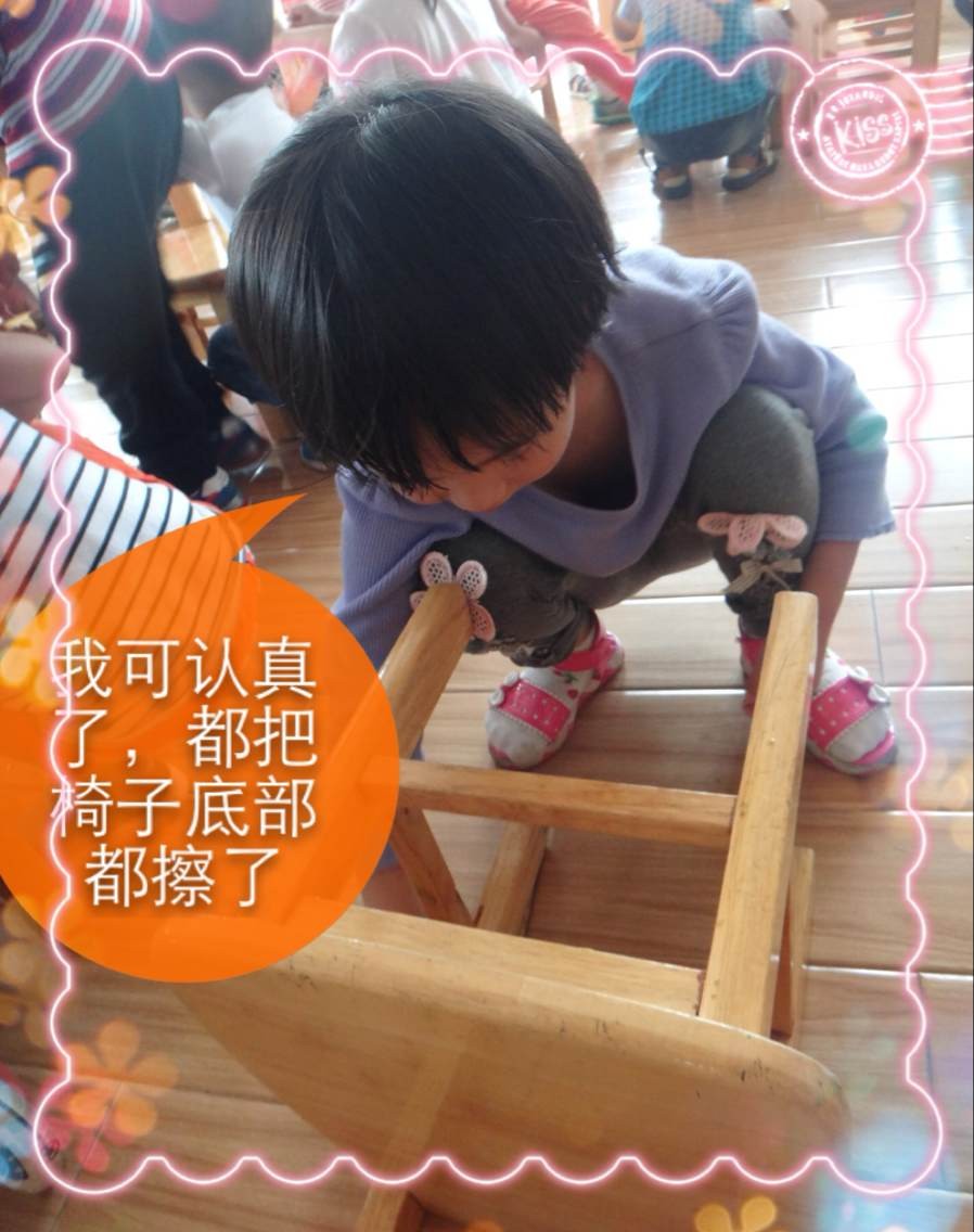 我上中班啦!现在我们是中班的小朋友,我们要当值日生啦!瞧我们的小手多能干,小椅子擦的多干净啊,夸夸我自己。