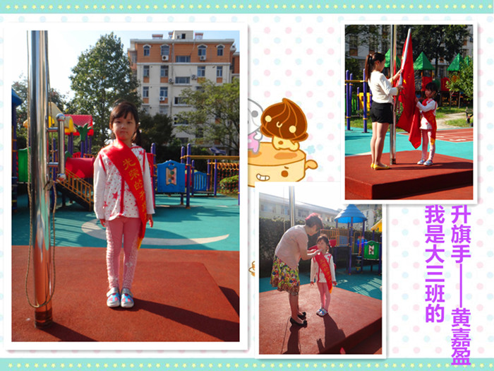 今天的升旗手来自大三班,她的名字叫黄嘉盈。她文明、礼貌,对教师、小伙伴有好礼让,自己的事情自己做。集体活动时能积极动脑发言,游戏时与同伴分工合作,是我们学习的好榜样。