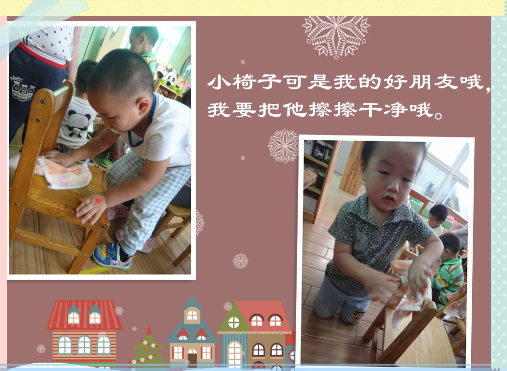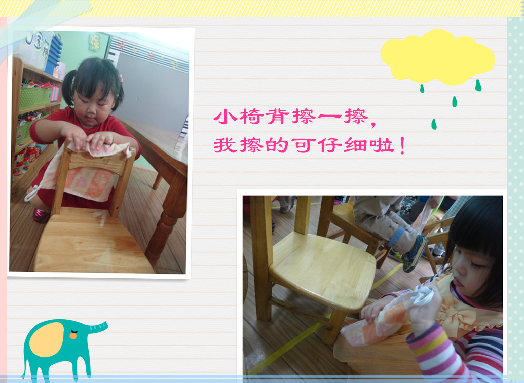 擦擦小椅子的椅子背,我每天都要和他们做朋友呢!