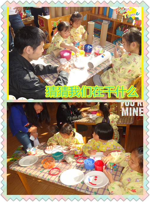 我们在玩游戏,爸爸妈妈你们猜猜我在干什么呢?看!我做的纸筒和盘子,好看吗,漂不漂亮!