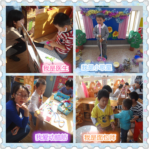 我是小医生,我可以帮妈妈看病;我爱唱歌,妈妈你可以叫我小歌星,让我唱首歌给你听;我爱动脑筋,你可以夸夸我;这里是面包房,我是面包师傅,这里有好多面包。