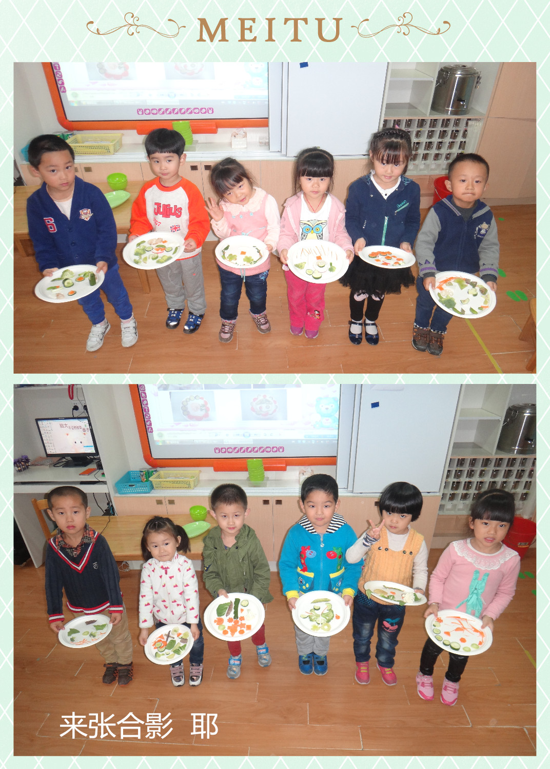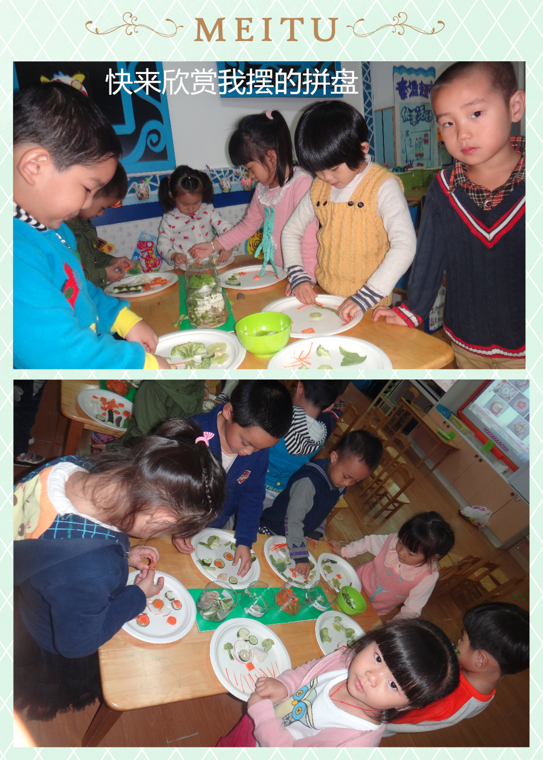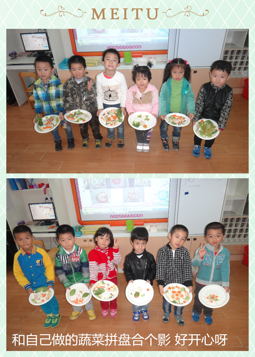 今天,我们进行了一次有趣的活动,我们用爸爸妈妈从家里带来的蔬菜水果在盘子上进行拼摆游戏!这次活动可有趣啦!我们自己第一次动手在纸盘上拼摆出好看的蔬菜拼盘!我们通过自己的想象力成功的摆出了一盘盘多种搭配、造型各异的蔬菜拼盘画哦!下面一起去欣赏下我们变成小小艺术家的身影吧!