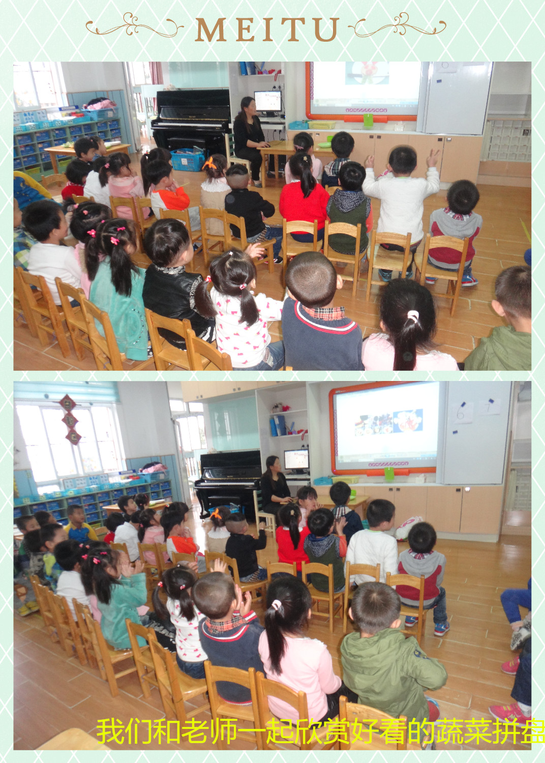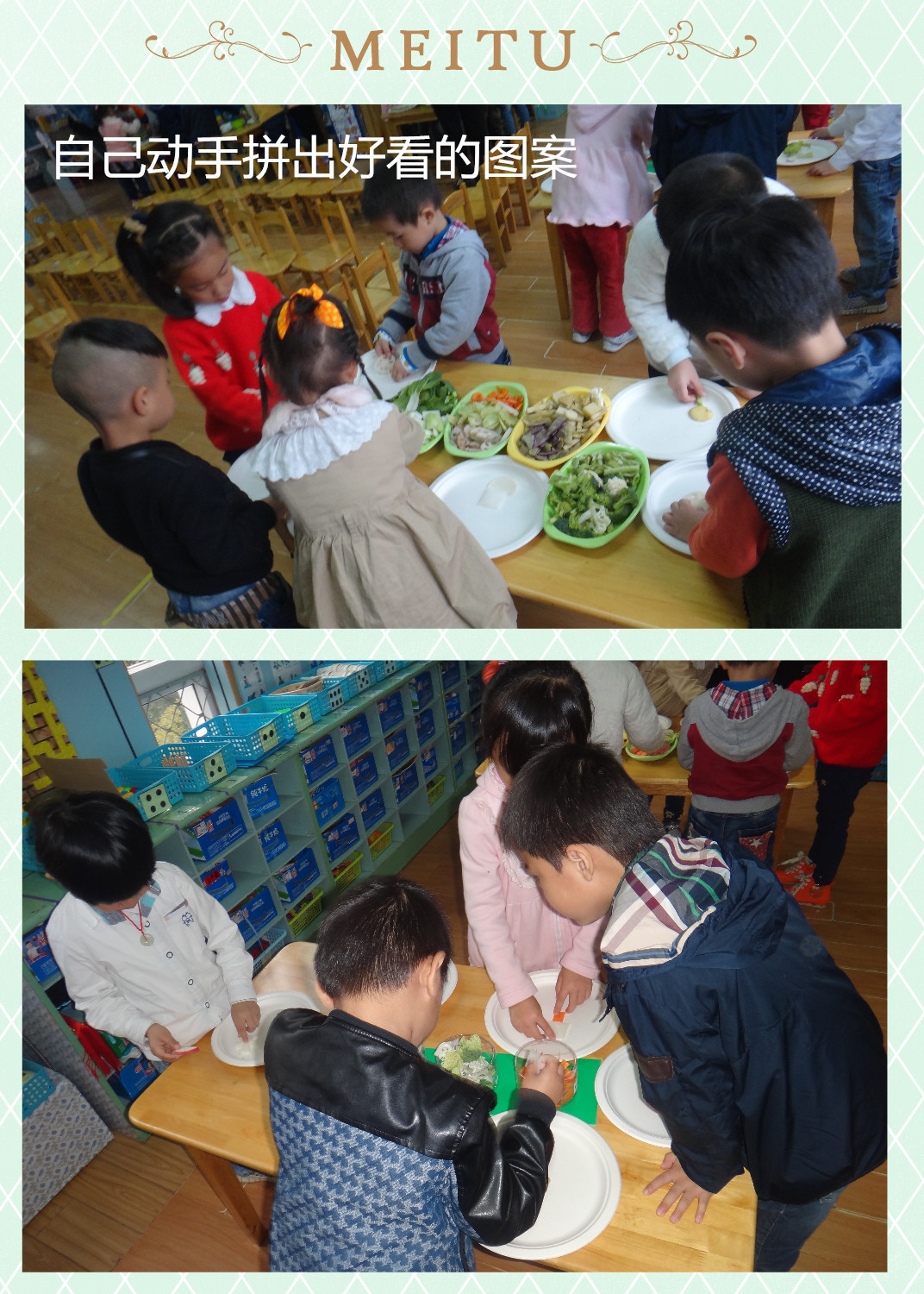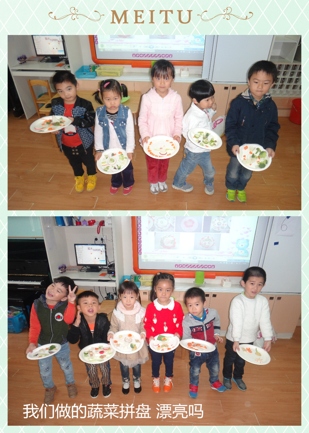 今天,我们进行了一次有趣的活动,我们用爸爸妈妈从家里带来的蔬菜水果在盘子上进行拼摆游戏!这次活动可有趣啦!我们自己第一次动手在纸盘上拼摆出好看的蔬菜拼盘!我们通过自己的想象力成功的摆出了一盘盘多种搭配、造型各异的蔬菜拼盘画哦!下面一起去欣赏下我们变成小小艺术家的身影吧!