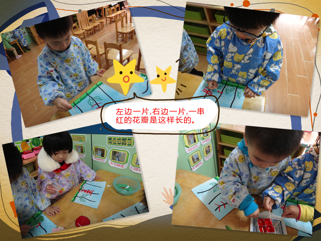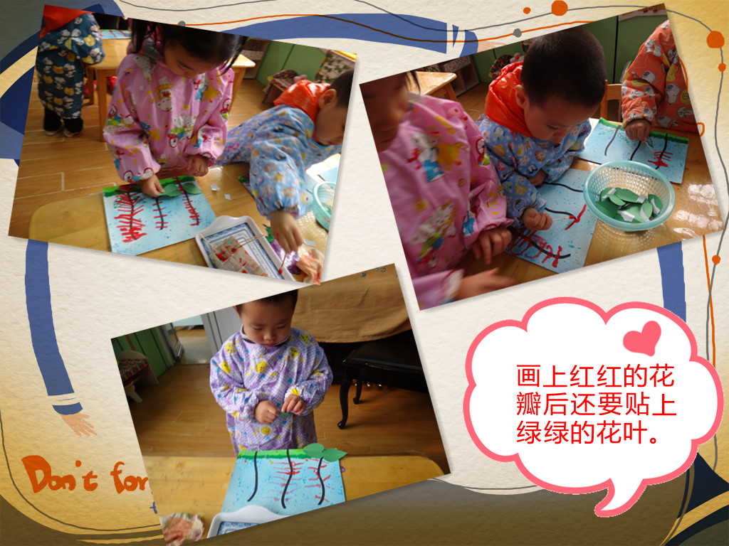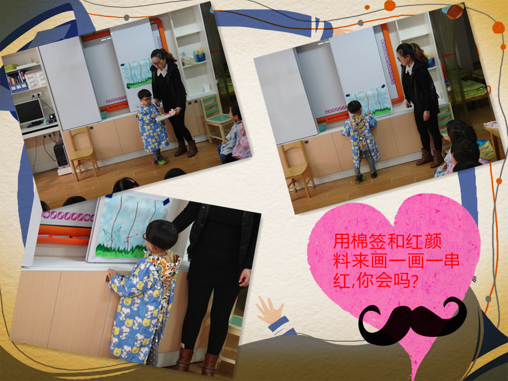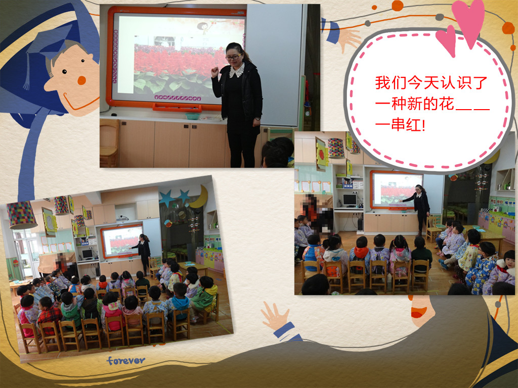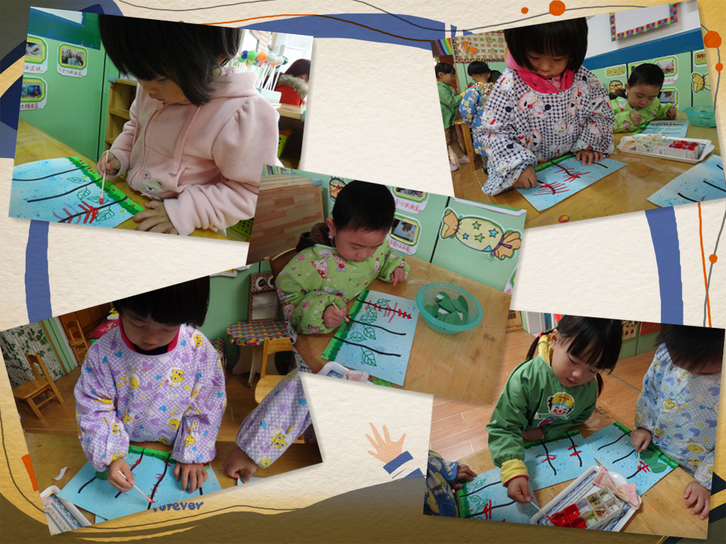 今天我们认识了一种花——一串红,它的花是红红的,一串串的,像鞭炮,像糖葫芦,还像烤香肠,哈哈,一串红多有意思啊,你喜欢这种花吗?看看我们用棉签和颜料画的一串红也很有趣哦!