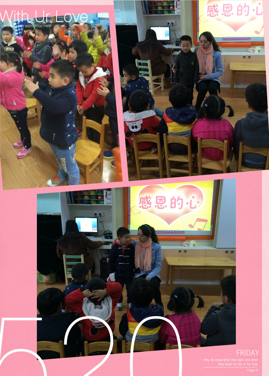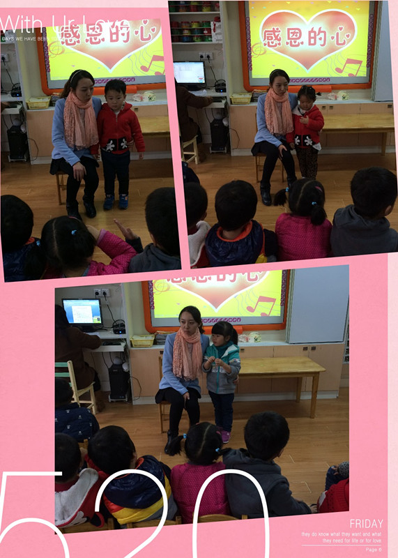 为了培养孩子懂得珍惜别人的爱,懂得感恩,做一个富有爱心的人,感恩节当天,我们翠屏山幼儿园中六班开展了以“感恩有你,浓情感恩节”为主题的班级感恩节教育活动,让中六班的宝贝们能够“心怀感恩,懂得感恩”!