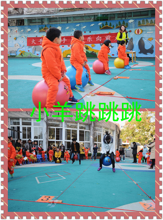 现在正式比赛,首先“小羊跳跳跳”我们要跳完羊角球送给爸爸妈妈,让他们跳。