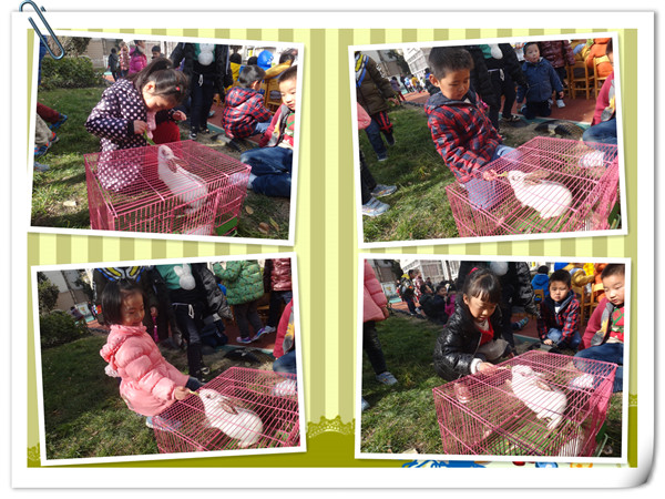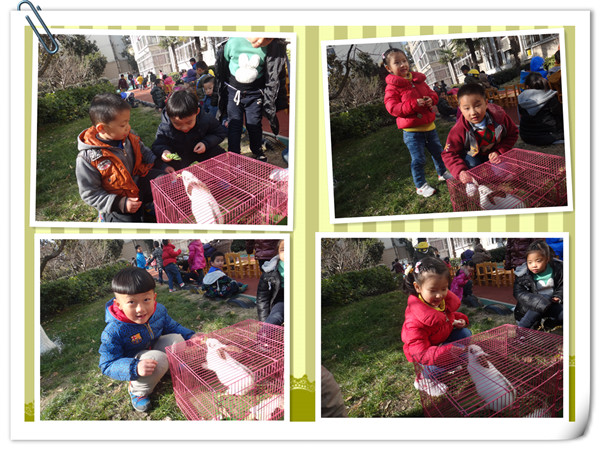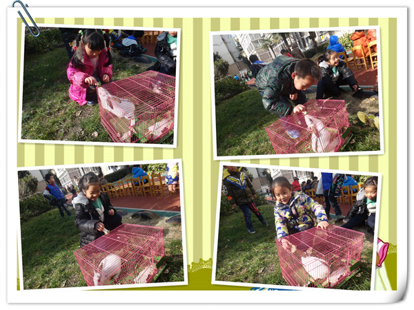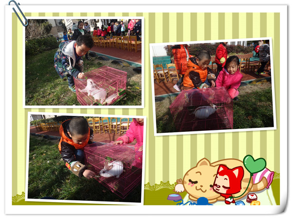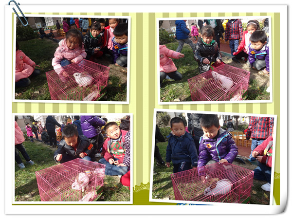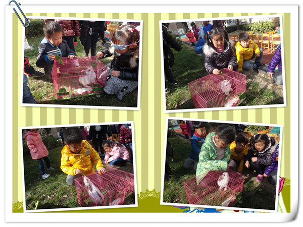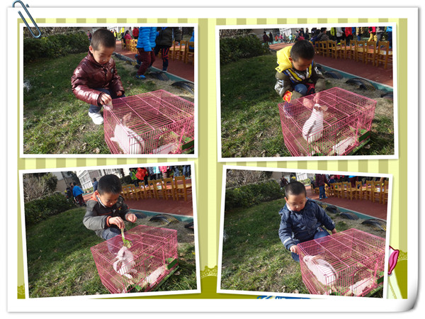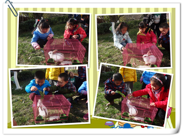 中一班养了一只可爱的小兔子,白白胖胖,真可爱!它还爱吃大白菜,我们每天散步都要去看望它,真想和它一起玩!今天,我们获得了小白兔主人的同意,让我们去喂小兔啦,它真的好可爱呀!