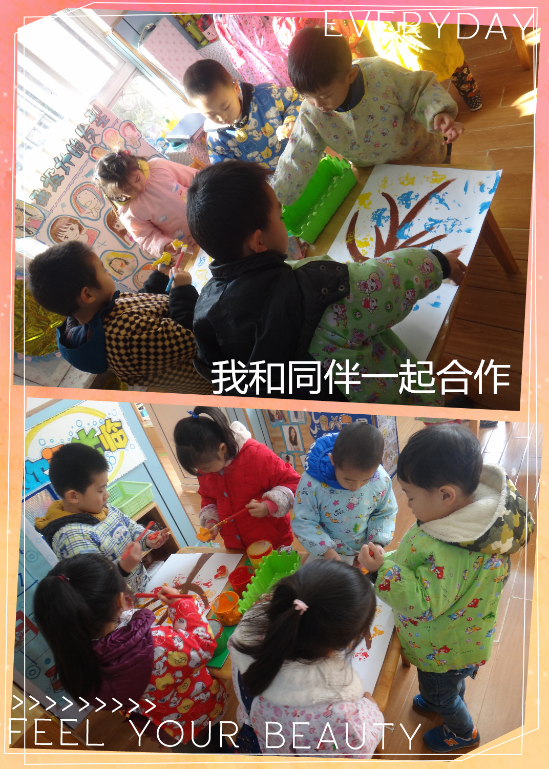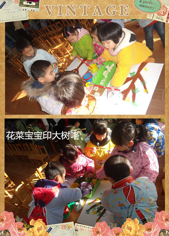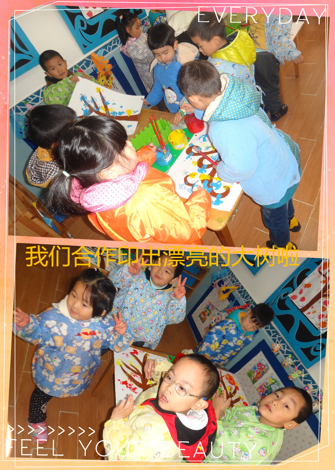 我们班级的美术特色活动是以色彩为主,这个星期我们用一个新鲜神奇的蔬菜宝宝和颜料做游戏——花菜。老师在讲解示范以后,请小朋友们小组合作在已经画好大树树干和树枝的纸上面,用老师事先切好的花菜宝宝去和颜料亲亲嘴,然后使劲的印在大树的树枝上,顿时大树的枝干上就留下了一个个美丽的花菜宝宝的花纹印,一棵棵大树上就慢慢长满了树叶。最后小朋友们都在小组合作印画的过程中体会到了印画玩色的快乐!