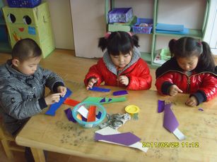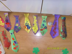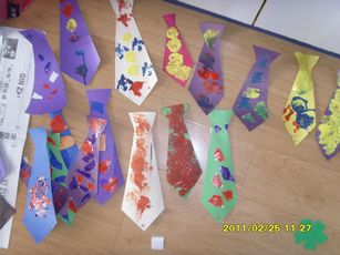 瞧!我们正在用纸团盖印、撕贴的方法来装饰领带。