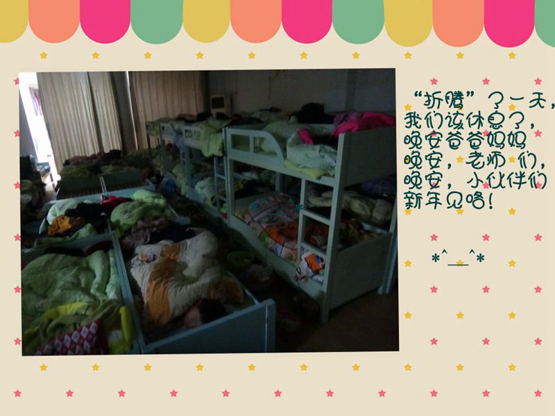 新的一年就要到来,在这喜庆的节日里,我们翠屏山幼儿园大班年级组的师生以特别的方法来迎接新年的到来——留宿。小宝们第一次离开爸爸妈妈的怀抱和小伙伴们在幼儿包饺子、拉歌、寻宝、洗漱、入睡。这么多的第一次,带给了孩子许多的挑战和快乐。在特殊的日子里以特殊的方式感受自己长大了。下面请跟随我的脚步一起来看看孩子们今天丰富多彩的活动吧!