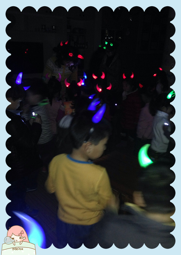 我们的牛角灯很漂亮吧,嘿嘿~我们大班小朋友都在一起做游戏呢~