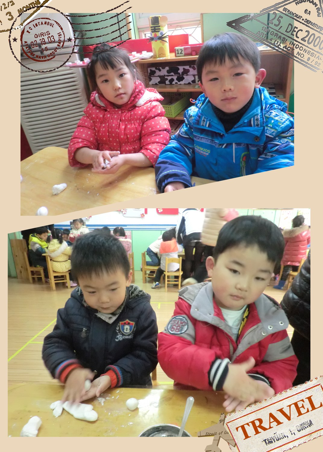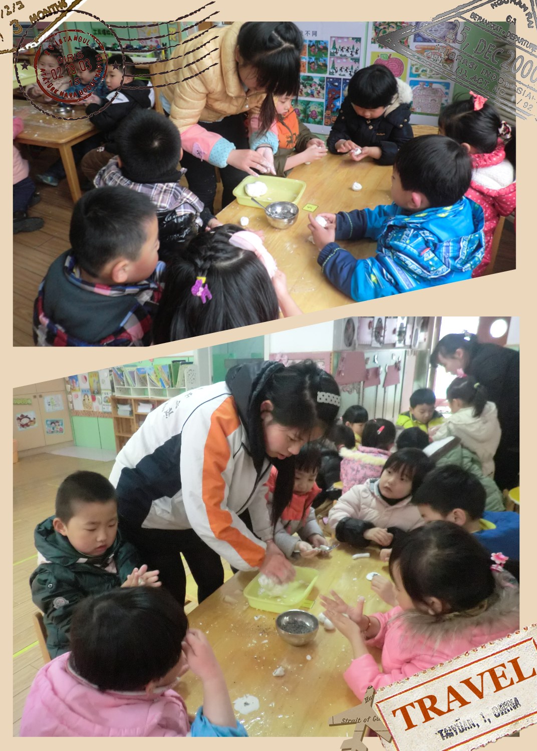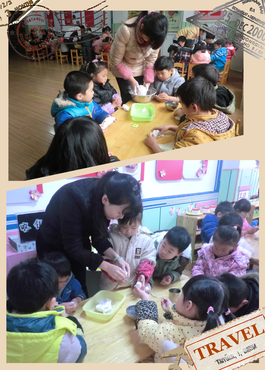 老师在帮着揉面团,看上去好用力啊。
