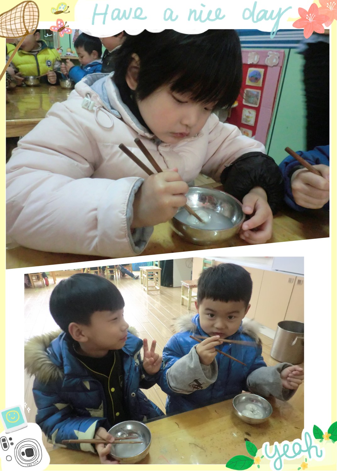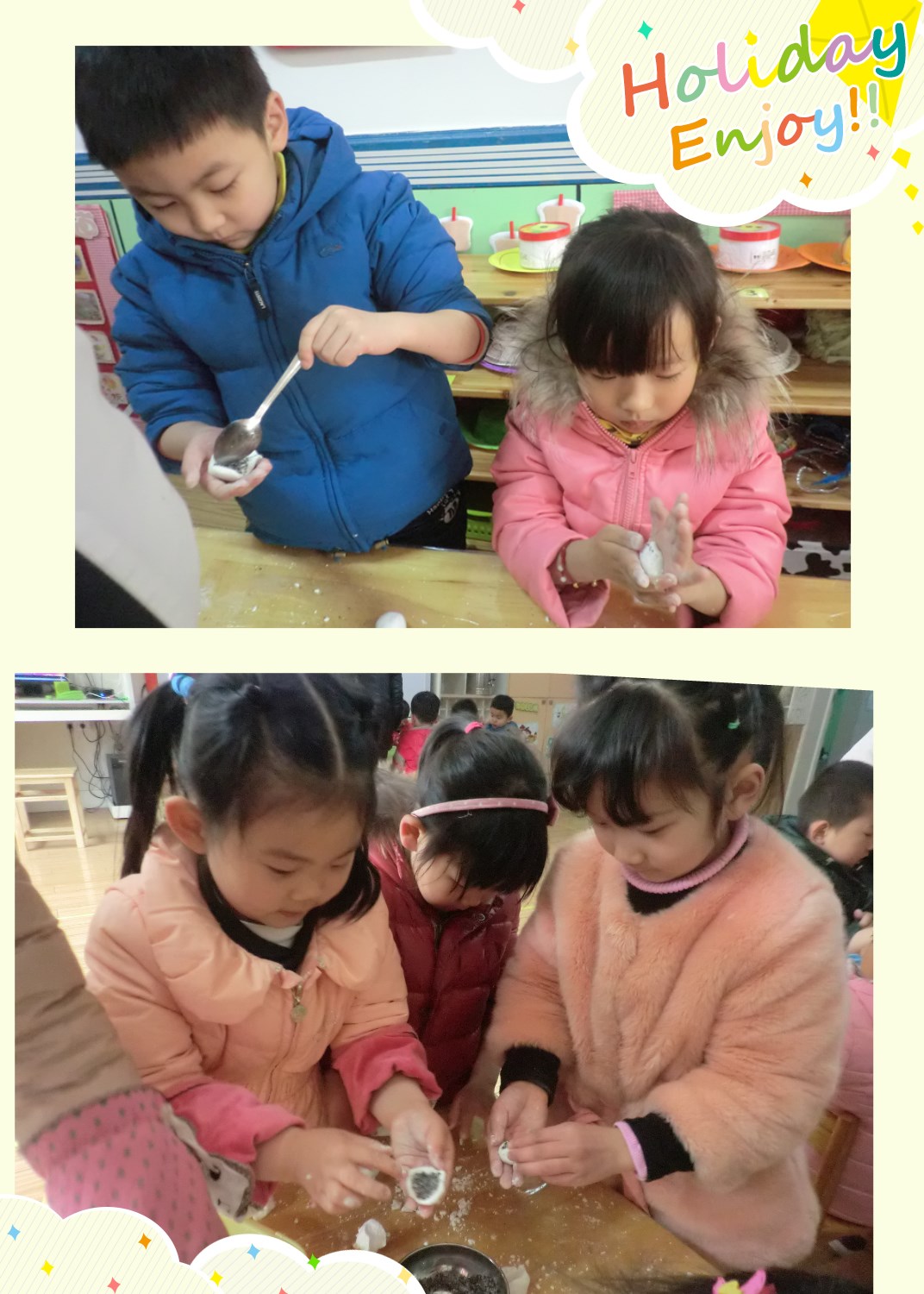 教师寄语:通过生动有趣的活动,让幼儿体验节日的快乐,感受集体活动的快乐。鼓励幼儿积极参与活动,幼儿在学、说、看、吃、玩中充分体会到节日的喜庆。进一步促进幼儿对事物或事情的兴趣。祝大家节日快乐!