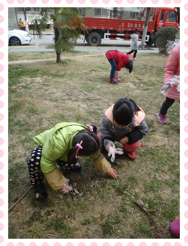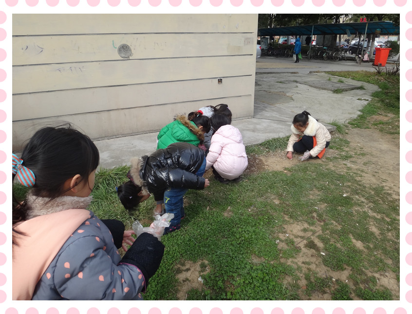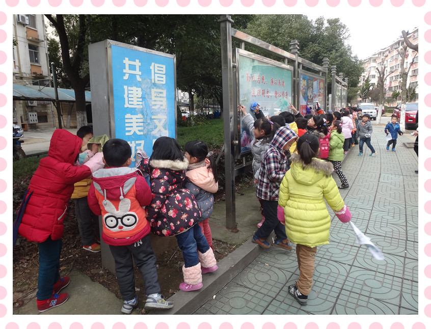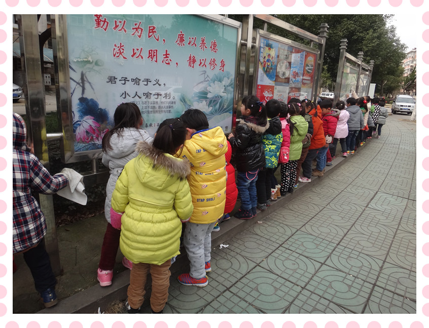 广告栏上的灰尘都给我们擦干净了呢! 草地上有好多垃圾呀,我们要去把垃圾都捡进垃圾桶!