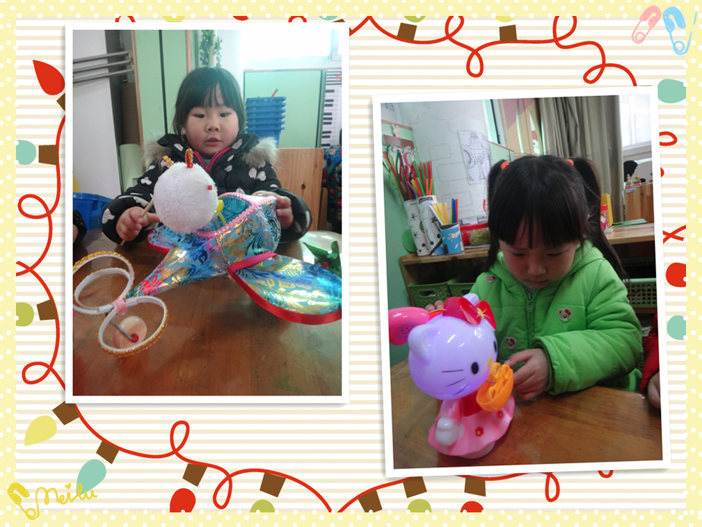 我和好朋友交换着欣赏花灯,我的小兔花灯给你吧!