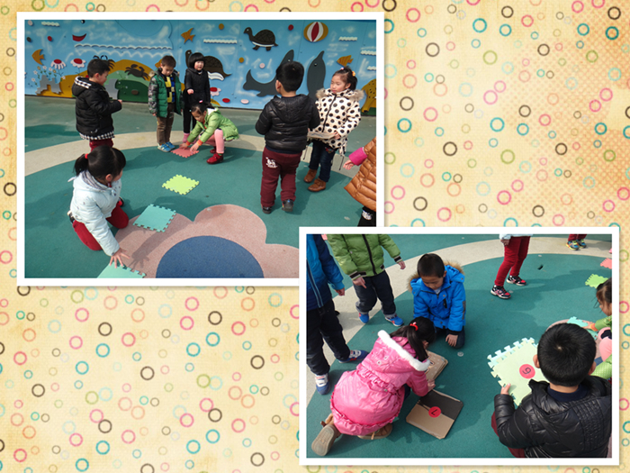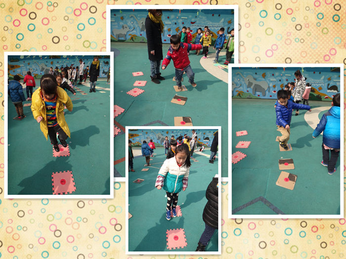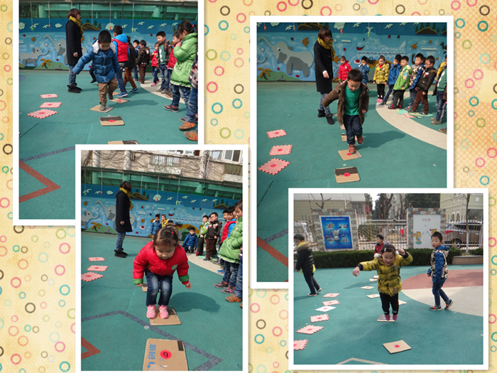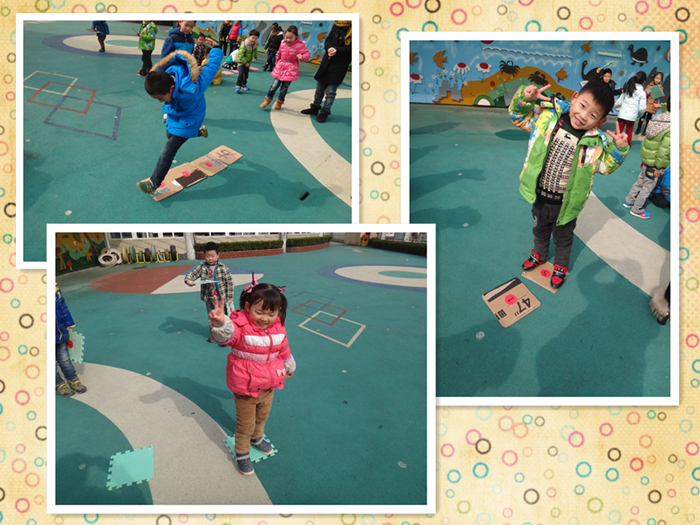 跳跳乐 太阳和煦,阳光明媚,在这温暖的日子里我们来到了操场上,用纸板玩了各种好玩的游戏。我们有的小朋友几个合作用纸板铺成了一条水中小路,一蹦一跳的通过了;有的小朋友铺成了一条宽宽的小河,飞快的跨过去了;还有的小朋友一个人用两块垫子边铺边跳前进。老师还教了我们一个新的游戏,边看数字边跳,如果纸板上的数字是双数就双脚跳,如果纸板上的数字是单数就单脚跳,真好玩! |