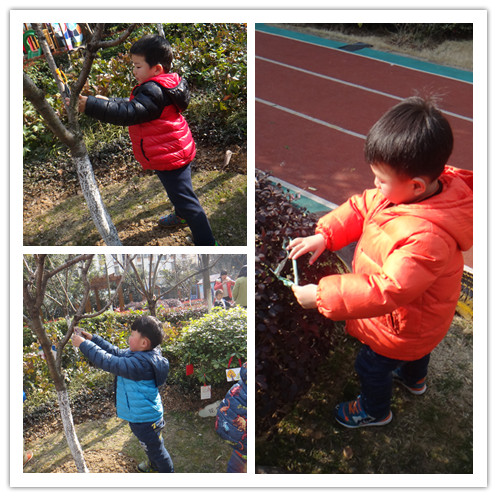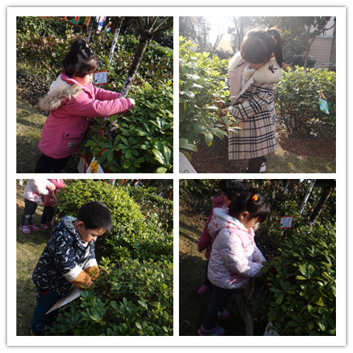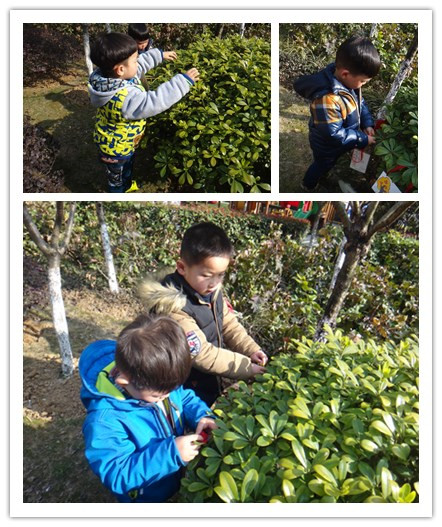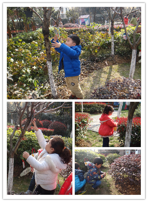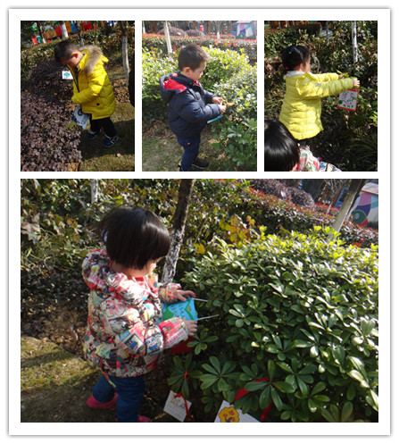 早晨我们认识了幼儿园里的树木,还了解了如何保护我们的小树,小朋友们你一言我一语,说的不亦乐乎;到了下午,我们就要去给我们幼儿园的小树林挂爱心卡片了,看,我们小朋友多能干!