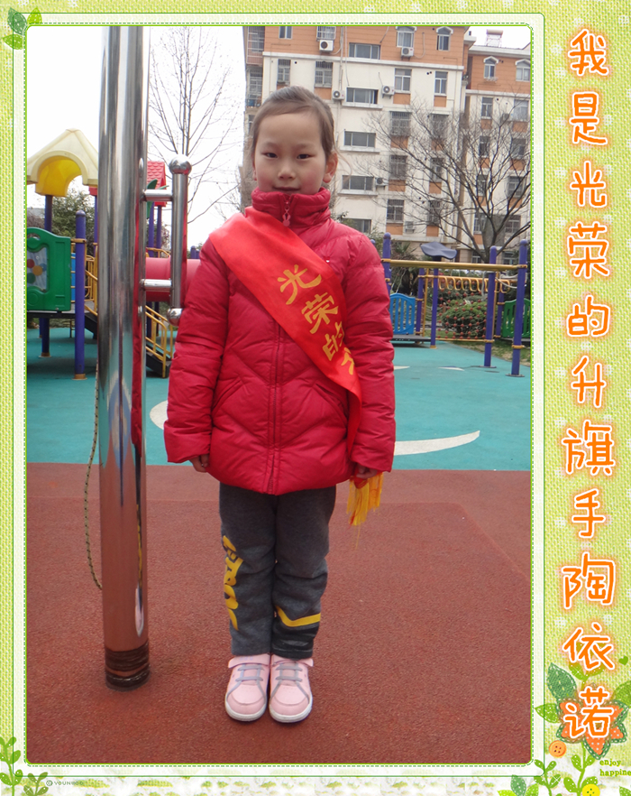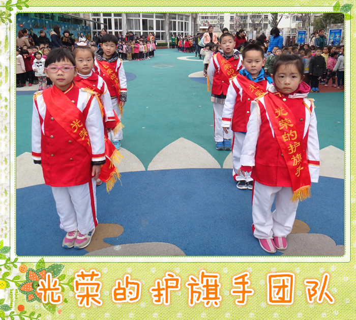 此时大家看到我们的升旗手——陶依诺端正地站在国旗台边上,笑容满面,神采奕奕。六位升旗手护卫着鲜艳的五星红旗在场外安静地等候着,守卫着美丽的红旗。升旗仪式正式开始,伴随着激昂有力的出旗乐曲,六位升旗手护卫着国旗,步履轩昂大步向前走,神气活现,赢得了老师、家长和小朋友们赞赏的眼光,有的家长们则成了摄影师,他们拿着照相机,为孩子们记录下这珍贵的时刻。国歌响起,升旗手有节奏地拉着升旗绳,鲜艳的五星红旗徐徐升起,全场的小朋友们伴随着乐曲唱起了国歌,歌声嘹亮,悦耳动听。国旗迎风飘扬,昭示着翠幼的孩子们在幸福的时代快乐健康的成长。