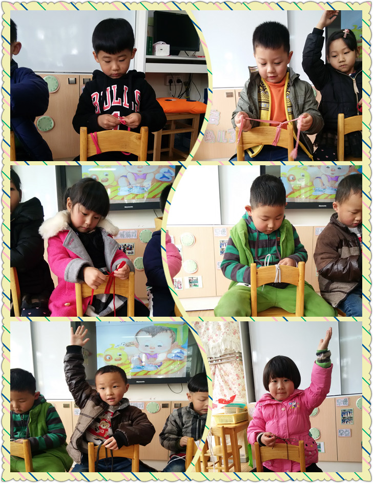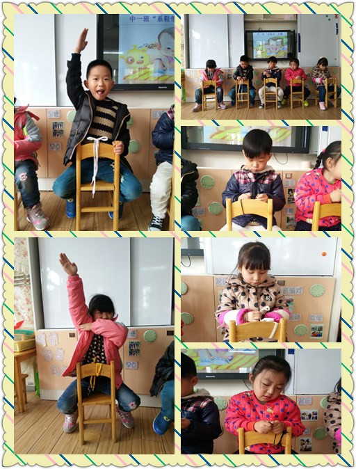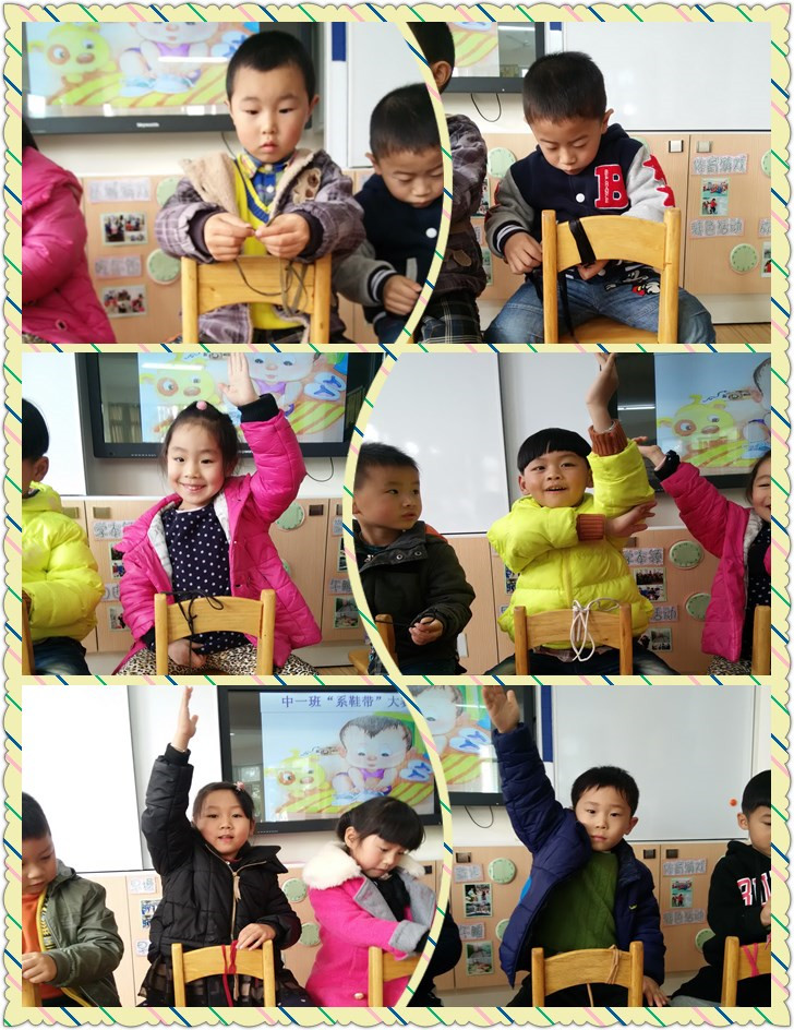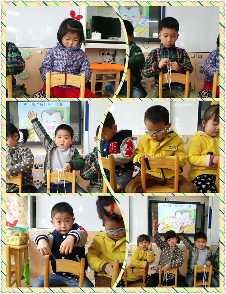 今天,我们中一班的小朋友要来比一比,看看谁系鞋带的本领最厉害!下面,比赛就要开始啦!