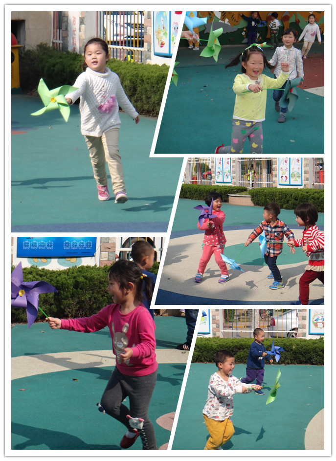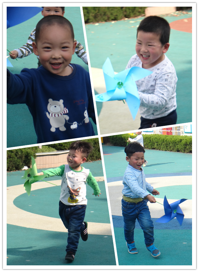一张正方形的纸,一根吸管,一个气球塞,就这三样东西,我们自制了一个风车,好开心啊,因为这是我们第一次自己动手做风车哦!虽然是第一次做风车,我们做的却是很成功的。下午的时候,老师带我们在大操场上玩风车,我们在操场上奔跑着,风车迎着风转动着,我们都好开心啊!