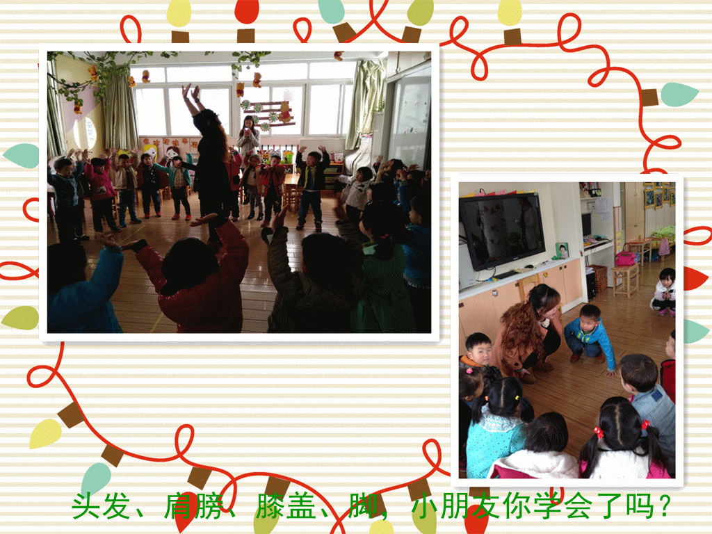 今天,我们班刘博文妈妈请来了专业的奥尔夫音乐老师给孩子们进行了一次美妙的音乐熏陶。大多数孩子在活动前对音阶都比较陌生,老师用身体的每个部分如:头、肩膀、肚子、大腿、脚等代表不同的音阶,通过好玩的游戏,让孩子们在游戏中学习,孩子们非常轻松地学会了本领。