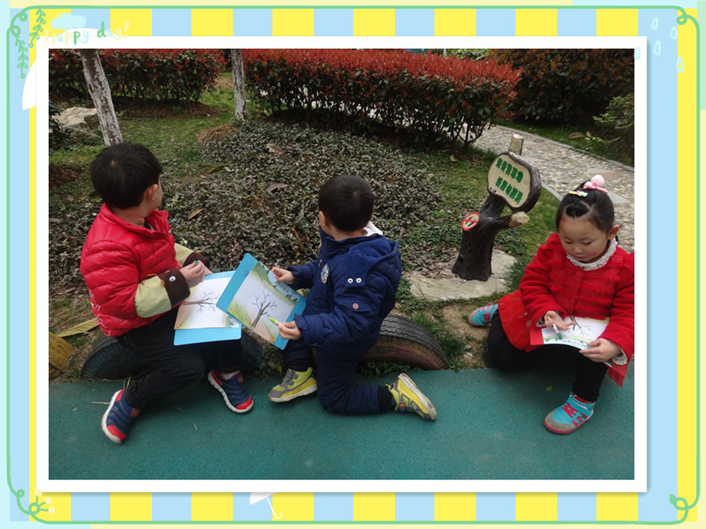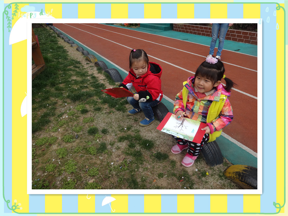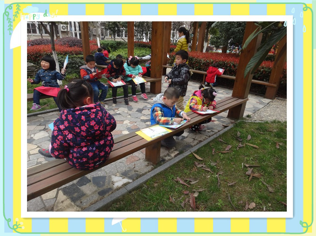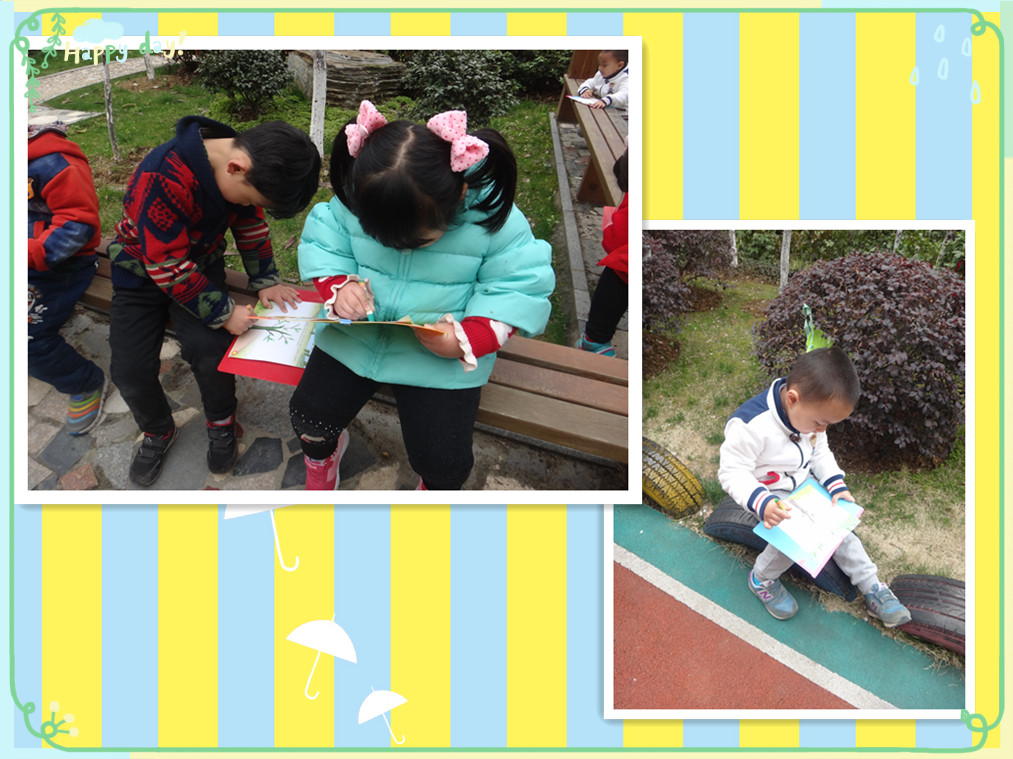 春天到了,幼儿园里的树枝发芽了,很多漂亮的花都开了,有漂亮的玉兰花,美丽的杏花,各种颜色的花可漂亮啦。小草也发芽了,绿绿的一片我们最喜欢啦。今天,老师带我们出去寻找春天的绿色了,还要记录下来哦,看看我们都找到了什么吧!