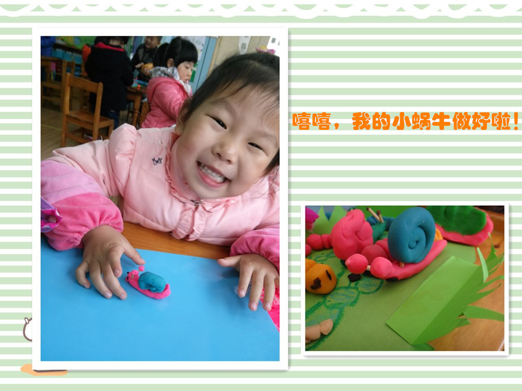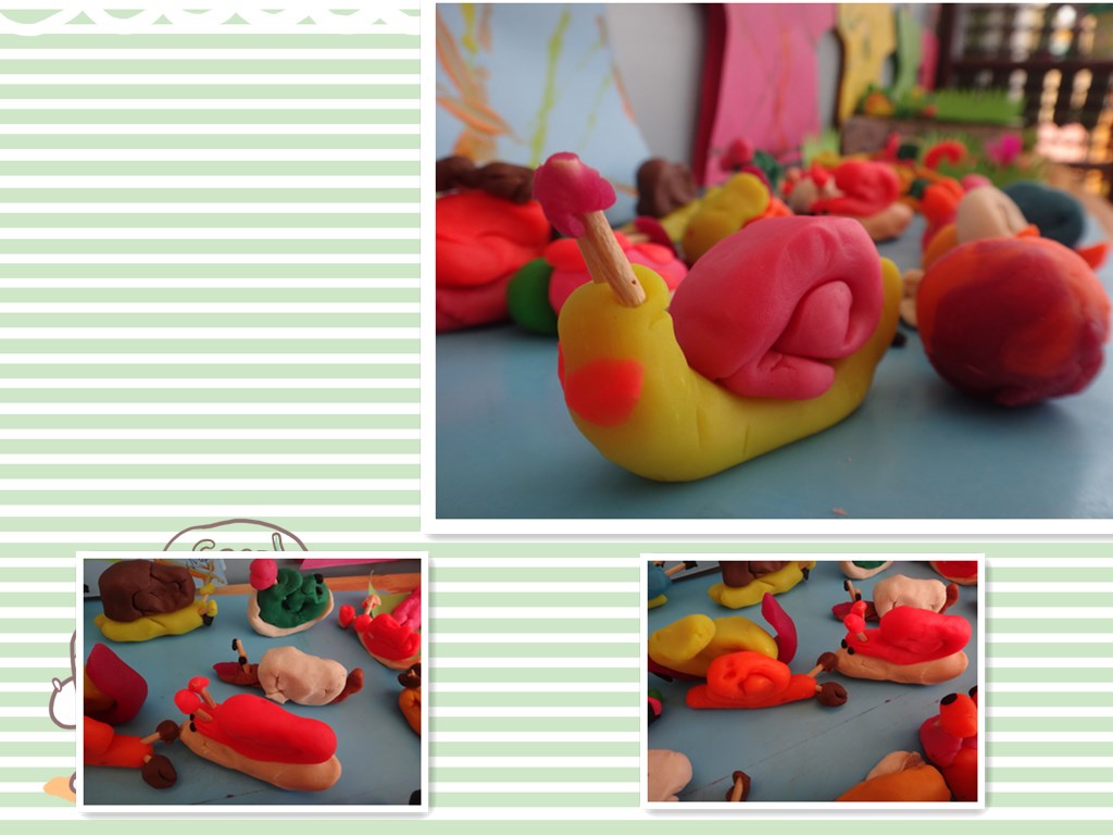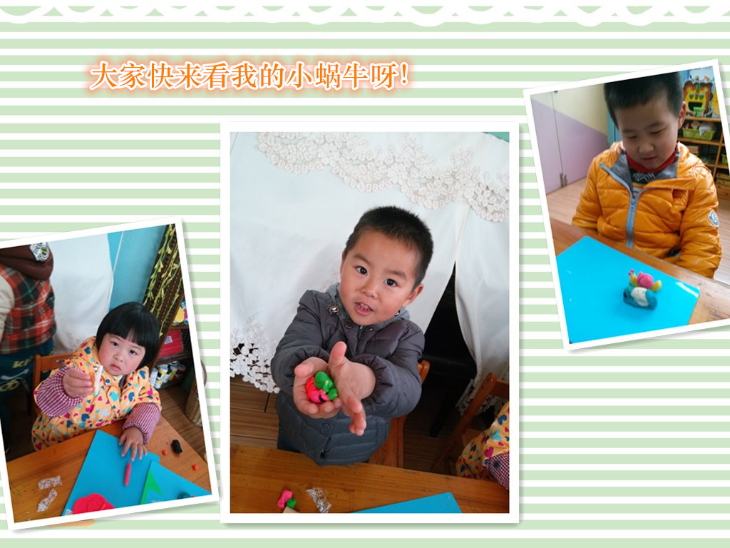 春天来了,小动物们都出来了,今天我们小五班的小朋友在老师的带领下,学会了用油泥做可爱的小蜗牛,小朋友做的蜗牛可漂亮了,有各种各样的颜色,有可爱的眼睛和漂亮的外壳,每一个都栩栩如生。小朋友在制作的过程中很开心,还一起和身边的小朋友分享自己做的小蜗牛。