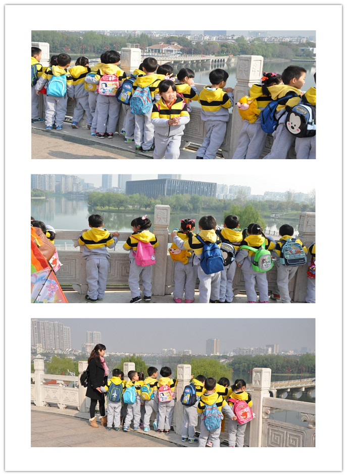 哇!上来了,我们看见了远处的大桥、高楼,还有方形的建筑物。融合在一起就像一幅春天的画。