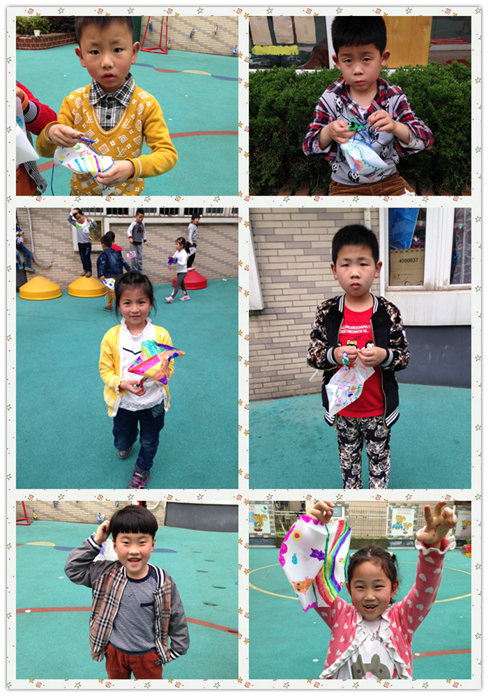 有趣的降落伞 今天我们每人做了一个漂亮的降落伞,先在一张透明的塑料纸上画上了漂亮的图案,有的是彩虹,有的是蝴蝶,还有有的是花朵,然后在边上的洞里穿上绳子,最后加上我们自制的小人,降落伞就完成啦!完成后,我们来到操场上,将降落伞抛得高高的,让它缓缓落下,就像降落伞从天空中落下来一样,真好玩! |
