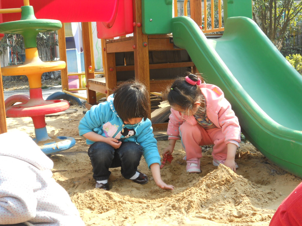 林宁,我们一起来堆个小山吧。 你们堆山,那我来帮你们运沙吧!