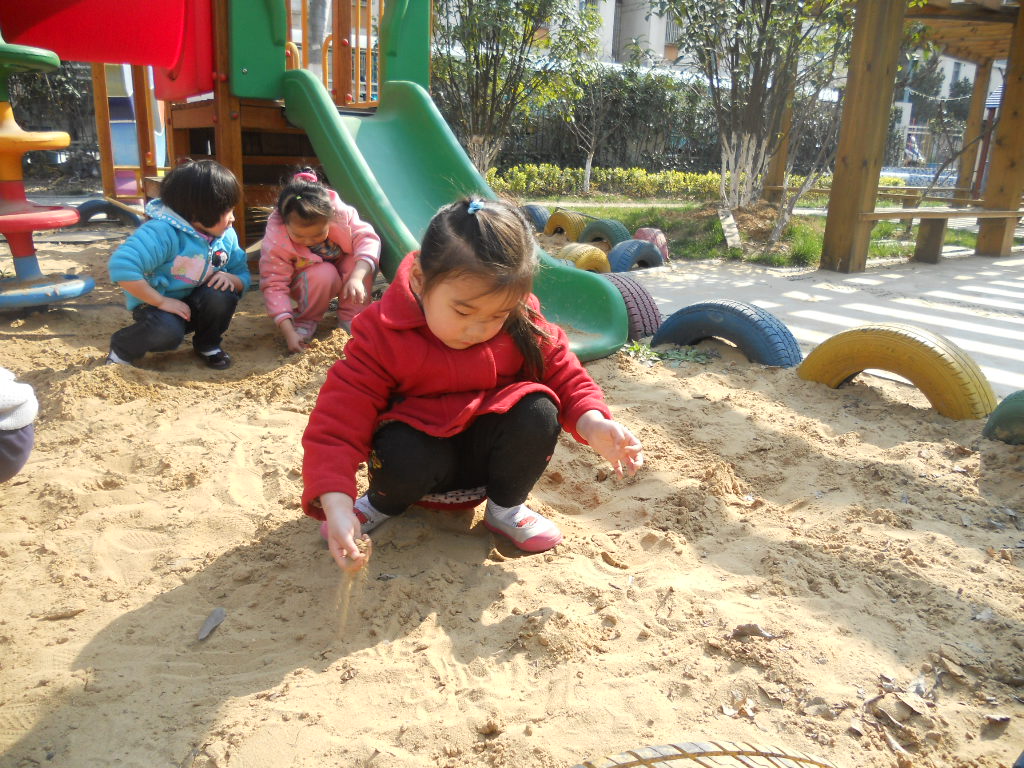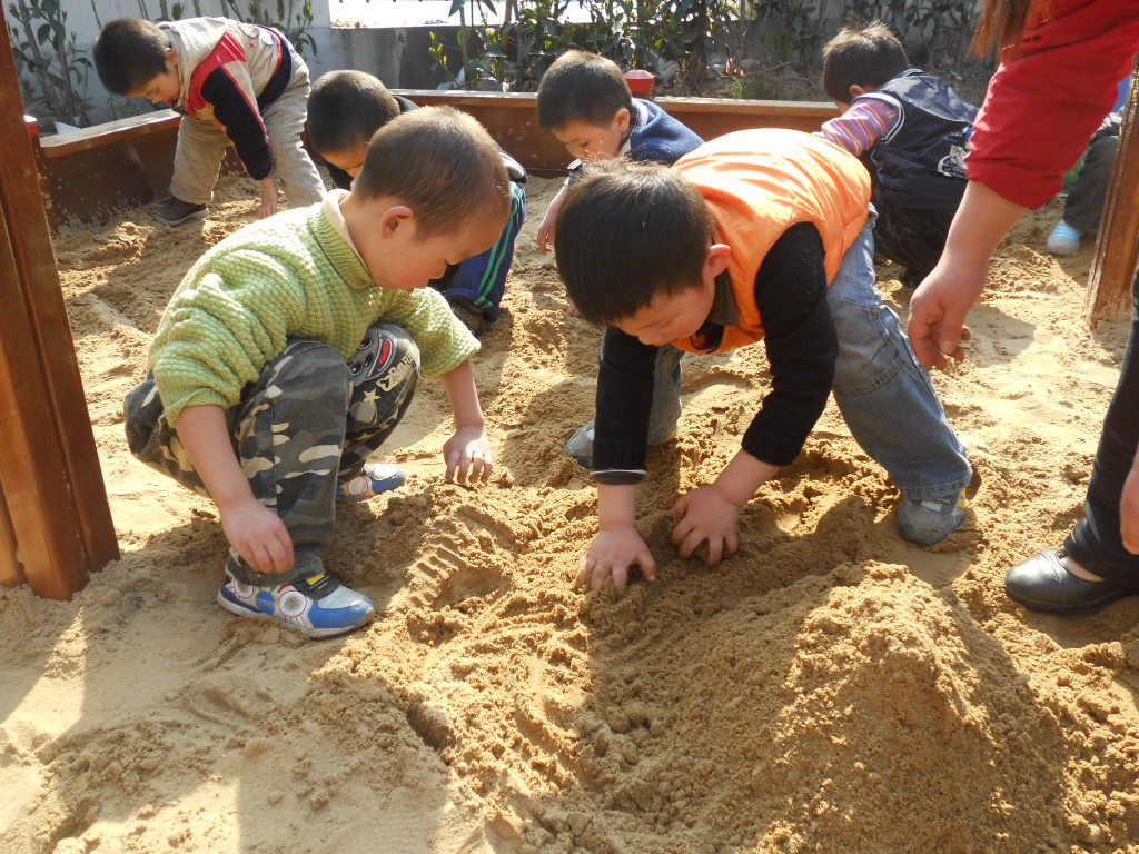 今天老师带我们来玩沙啦!我们可喜欢了,让我想想,今天我要来用沙玩什么游戏呢!