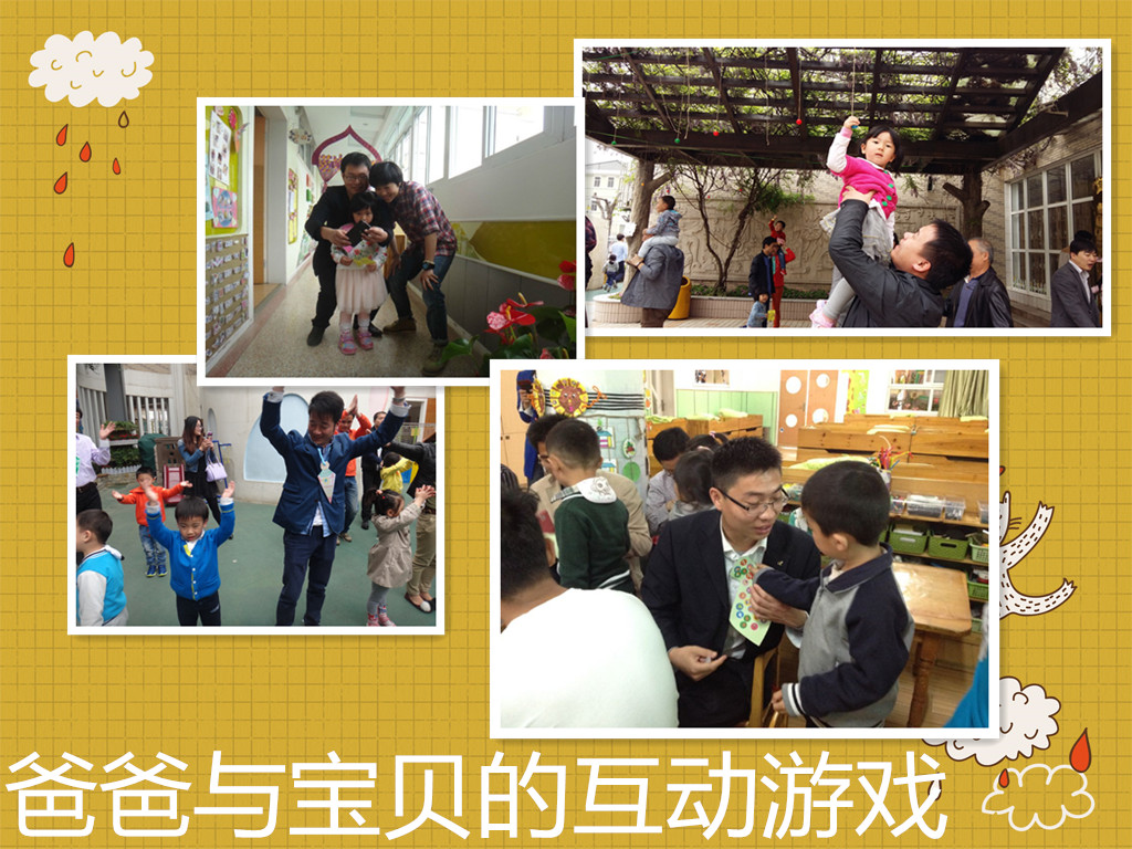 首先,家长和孩子在教师的组织下,集体阅读绘本《我爸爸》,感受了一个可爱、幽默,在孩子眼里却了不起的、伟大的爸爸形象,每个班级还将爸爸们的特长制作成ppt孩子欣赏后,为爸爸的本领感到骄傲,并将自己亲手制作的领带送给爸爸。