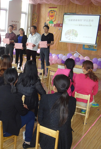为了更好的给孩子提供丰富、美味、营养的菜肴,进一步更新、调整幼儿园的膳食结构,优化孩子们的食谱,4月24日下午2点,翠屏山片开展了幼儿园食堂炊事人员创新菜肴制作评比活动,在各园所对创新菜肴进行研发的基础上,片区内的10家幼儿园推选了11道荤菜、11道素菜共计22道菜肴参加了此次评比活动,我园的张惠敏、李明福两位厨师参加了此次活动,参赛的菜品“果香鸡脯”、“五彩缤纷”受到大众评委的一致好评,荣获“最具推广价值菜肴奖”。此次评比活动既是幼儿园食堂工作的一次展示,也是一次很重要的园际交流,既给炊事人员们提供了互相观摩学习的机会,也能在交流中挖掘出一些值得推广的新式健康菜肴用以不断丰富幼儿的食谱。
