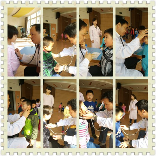 医生叔叔在给我们检查心跳、五官、视力和听力呢!我们很乖。