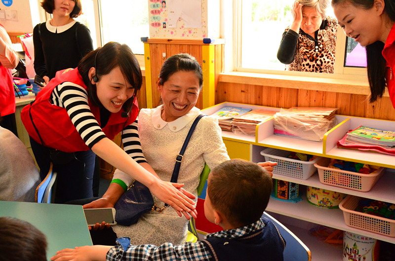 4月30日,翠屏山幼儿园10名教师代表、18名家长代表组成的志愿团队来到江宁特殊教育学校,与在校的孩子一起学习、做游戏,进行心与心的互动。