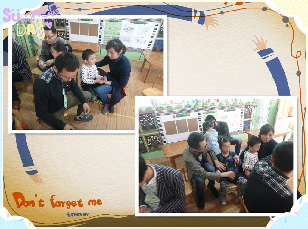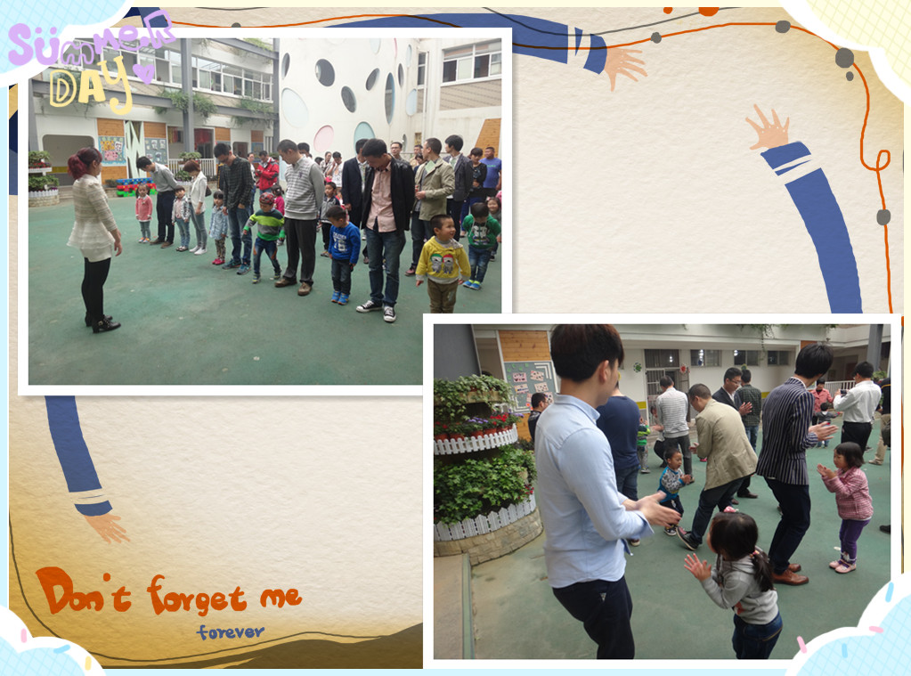 今天,爸爸陪我们来幼儿园做游戏哦,我们都好开心哦,这是爸爸第一次来幼儿园,爸爸陪我们做早操、看绘本、完成任务,好多好多的事情都是爸爸陪我们的。爸爸不会做操,我是小老师,教爸爸做操,我很能干吧。